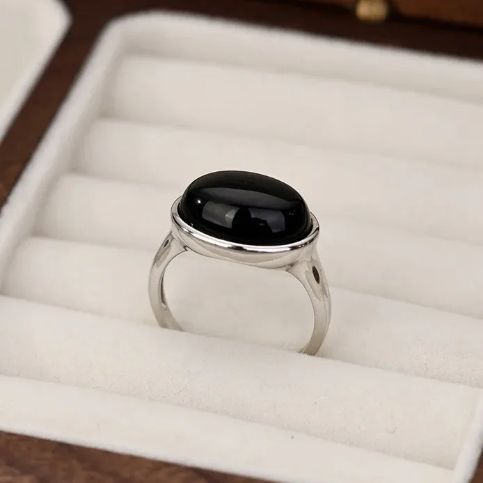 S925 Silver Chalcedony Oval Ring French Style Blac...