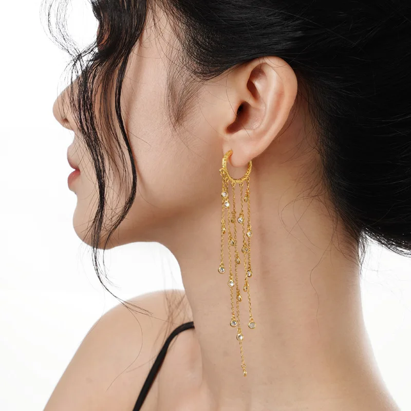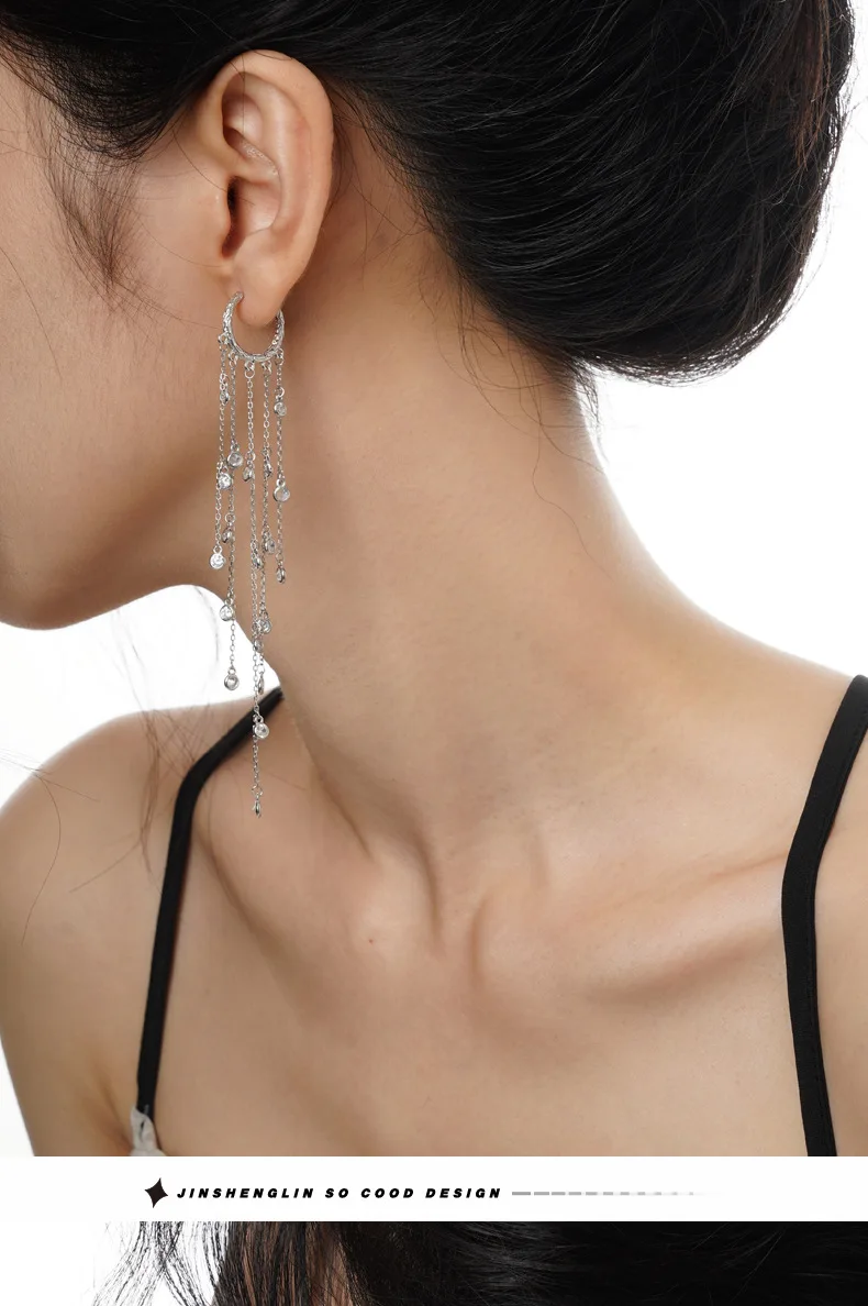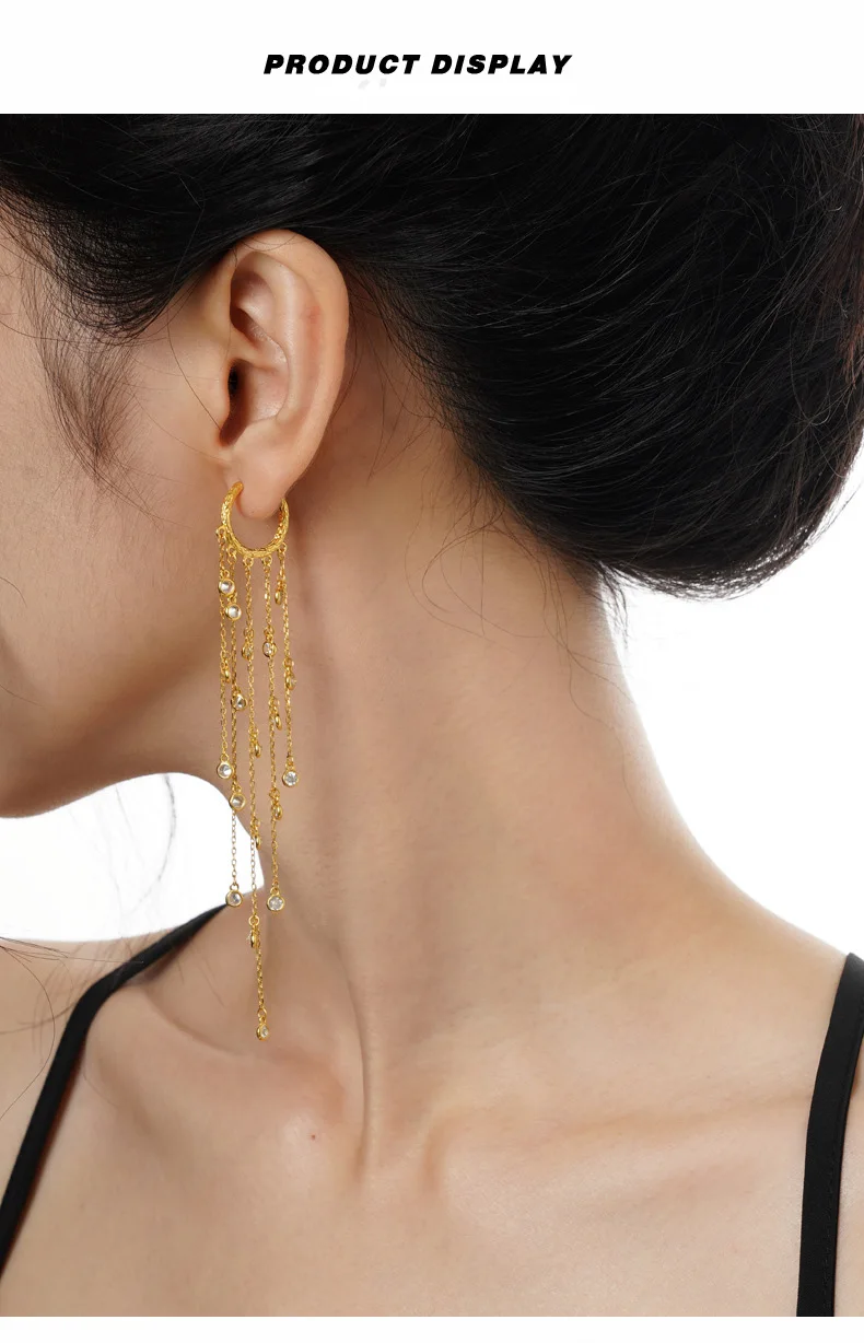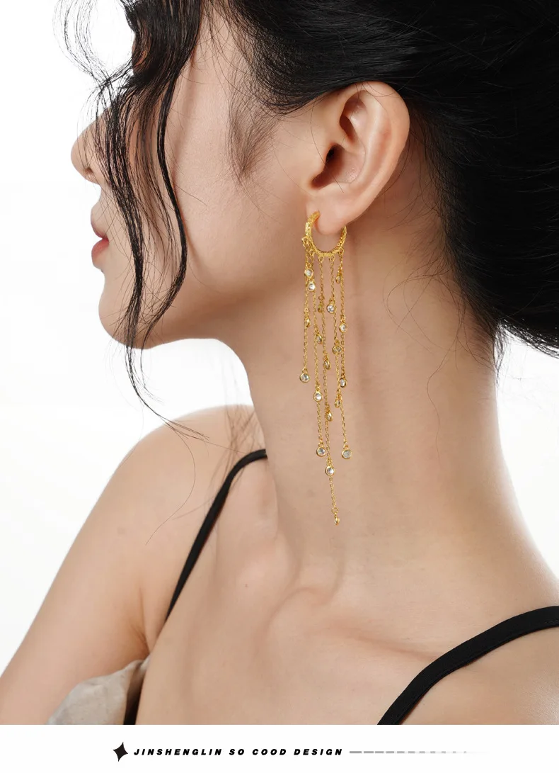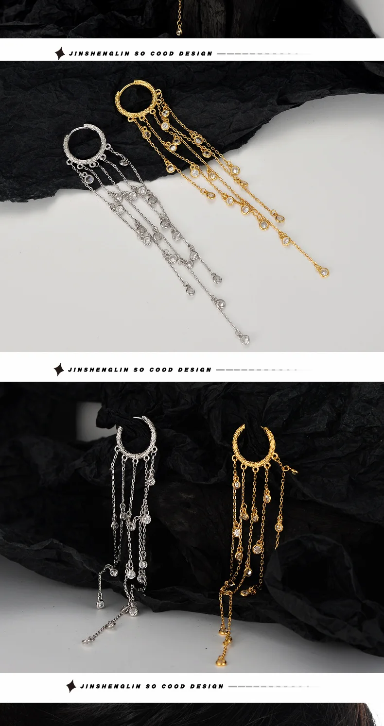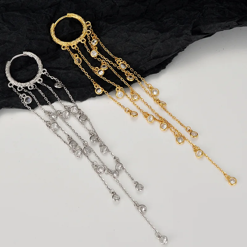 F.I.N.S CUSTOM S925 Sterling Silver Zircon Tassel Long Earrings Hanging Embossed Patterns Round Hoops Ear Buckle Fine Jewelry