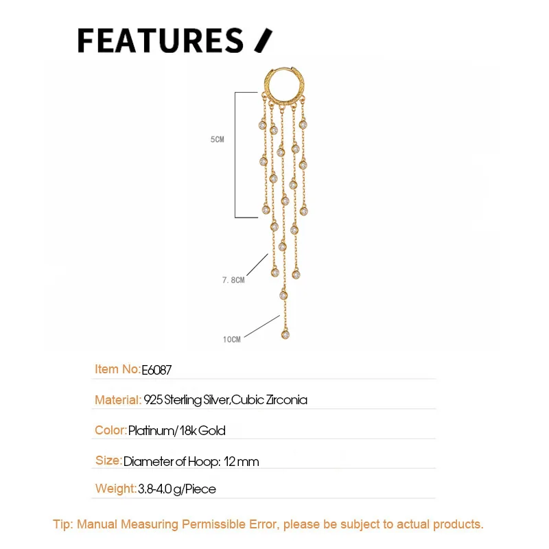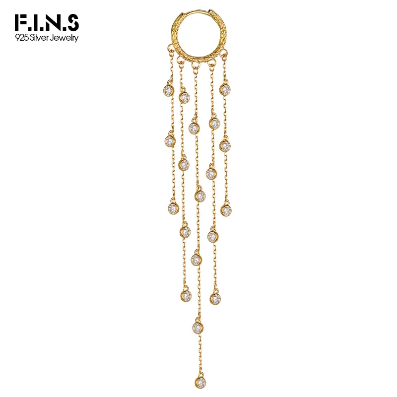 Jewel Type : F.I.N.S Custom S925 Sterling Silver Zircon Tassel Long Earrings Hanging Embossed Patterns Round Hoops Ear Buckle Fine Jewelry