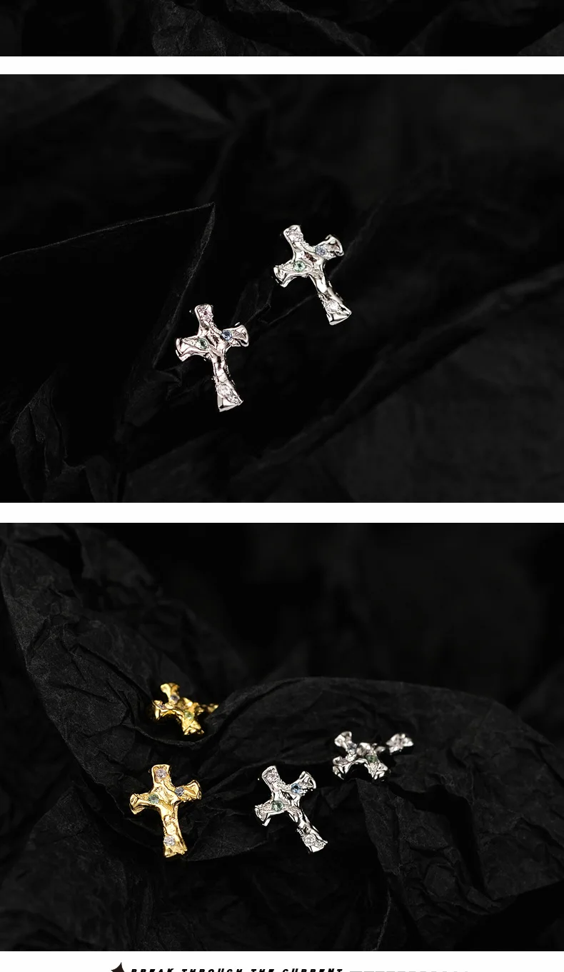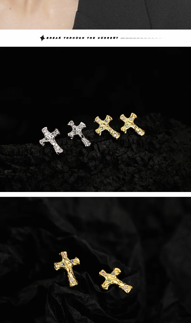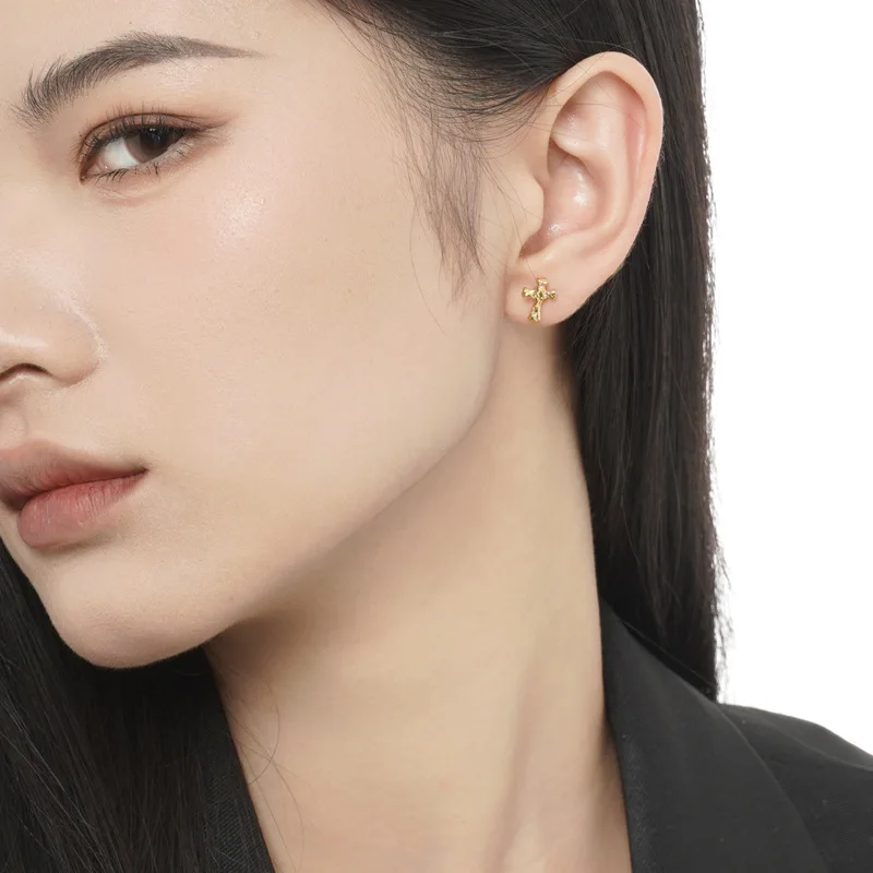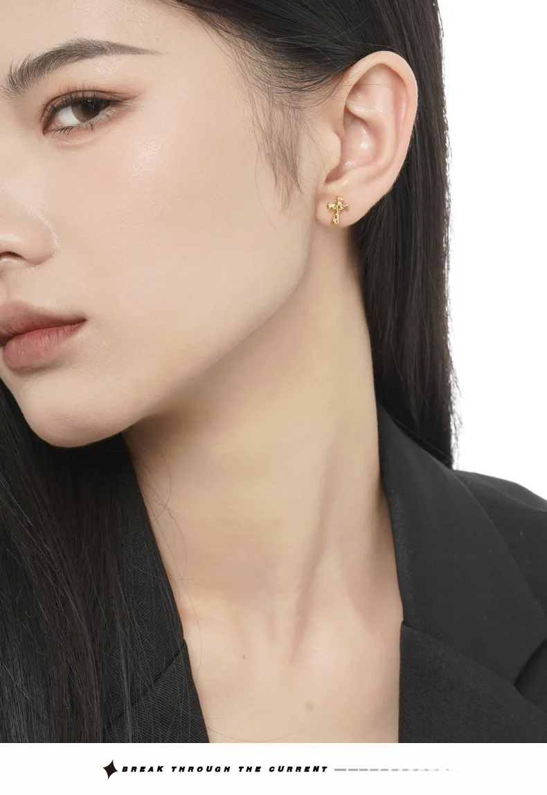 Jewel Type : F.I.N.S Korean Fashion Cross S925 Sterling Silver Zircon Stud Earrings Hypoallergenic Classic Punk Faith Earrings Fine Jewelry
