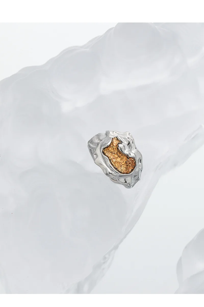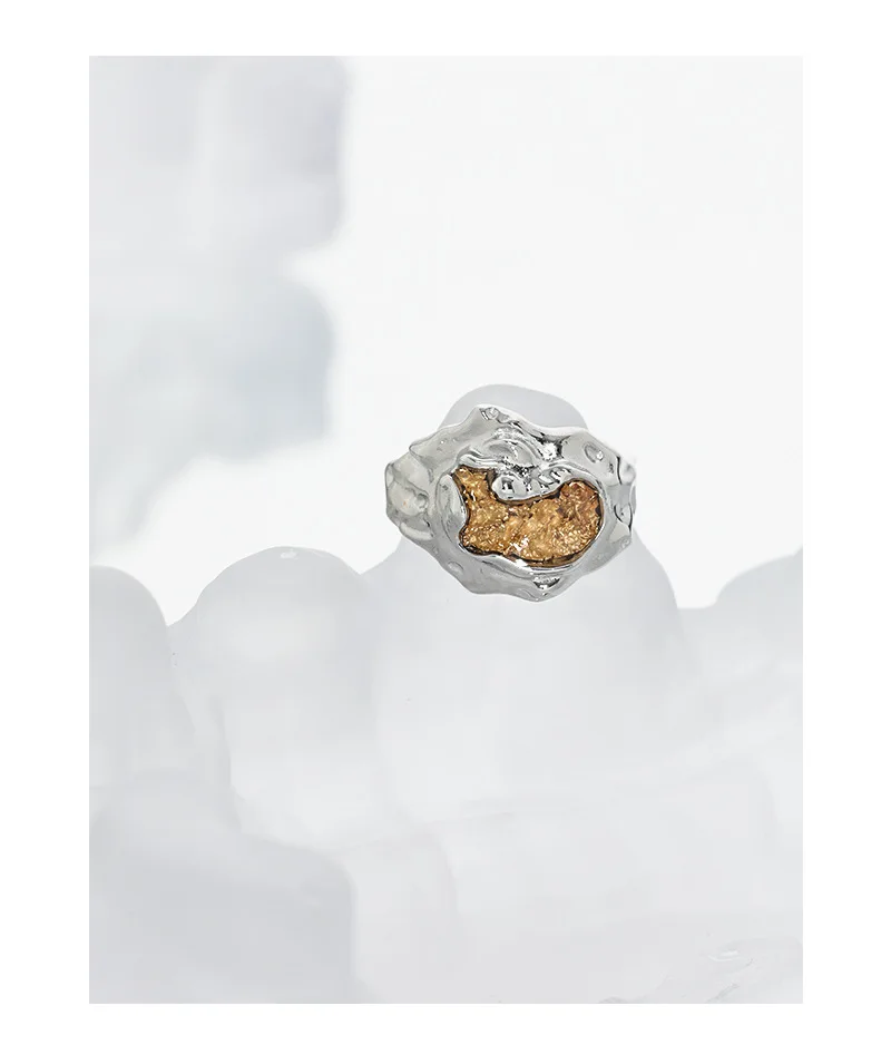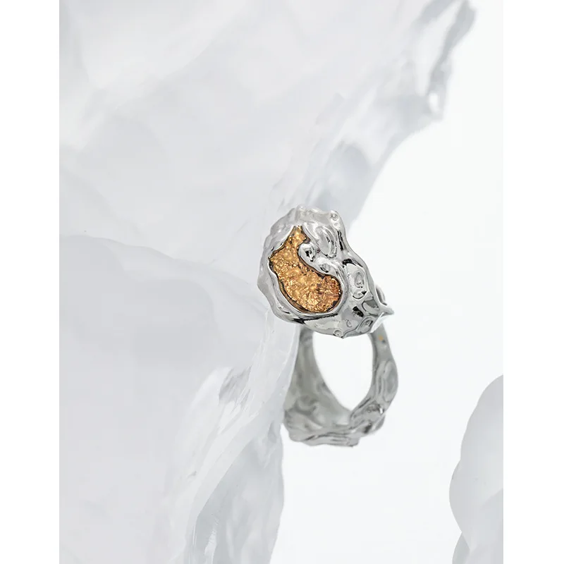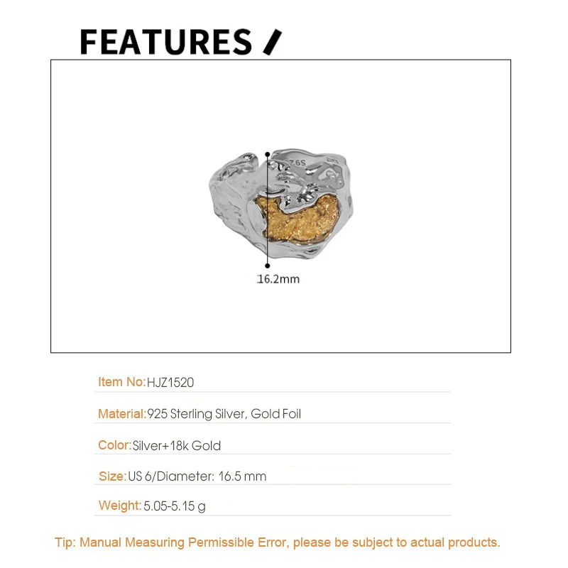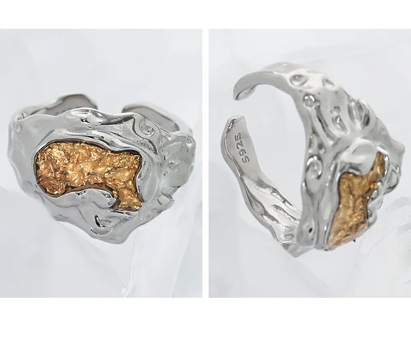 Jewel Type : F.I.N.S Korean Style Irregular Surface S925 Sterling Silver Gold Foil Inlaid Open Ring Wide Statement Resizable Women Fine Jewel