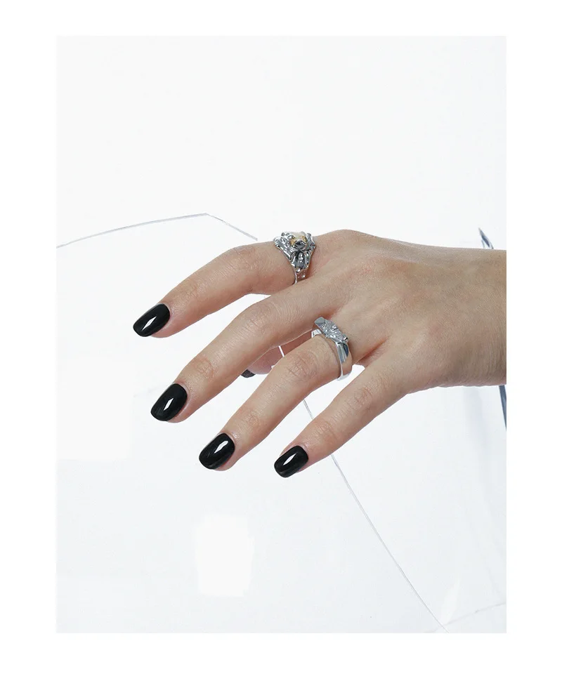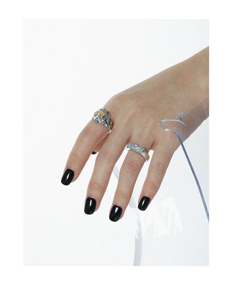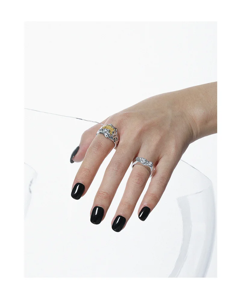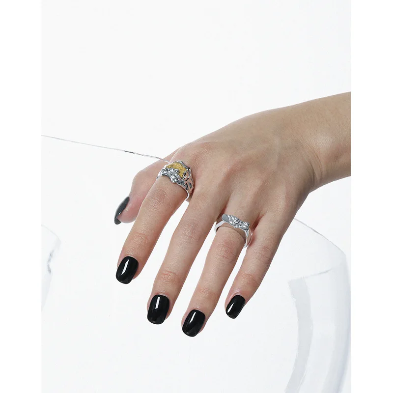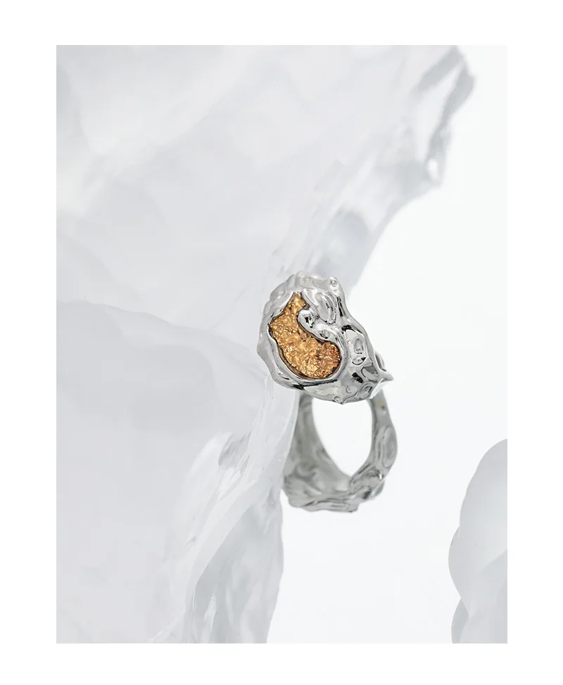 Jewel Type : F.I.N.S Korean Style Irregular Surface S925 Sterling Silver Gold Foil Inlaid Open Ring Wide Statement Resizable Women Fine Jewel