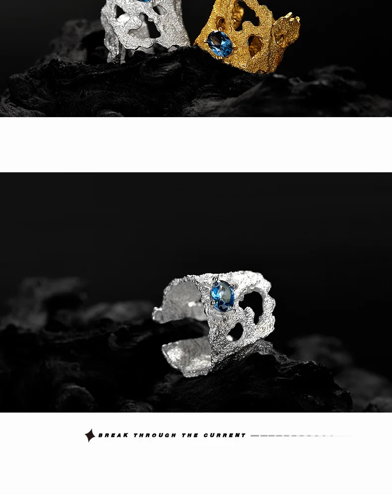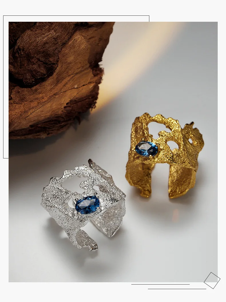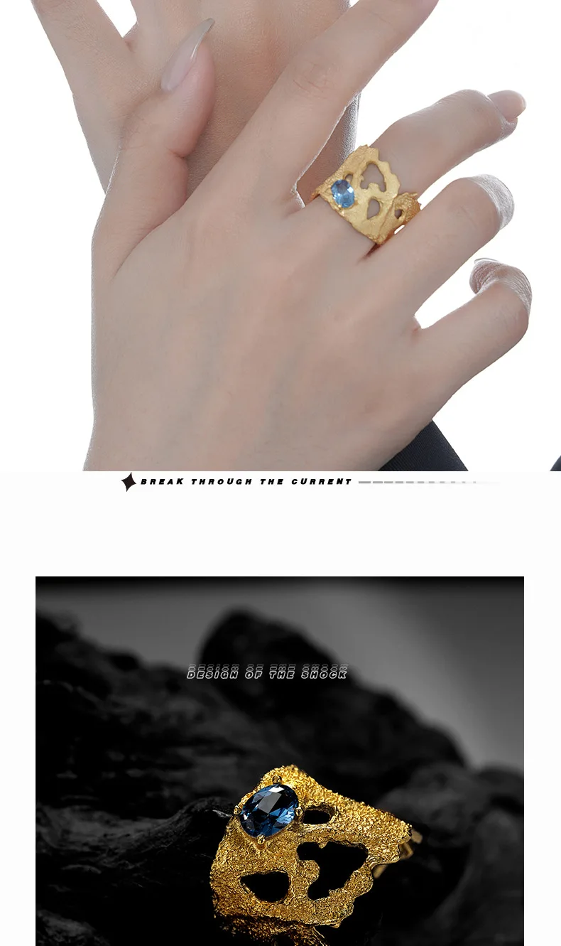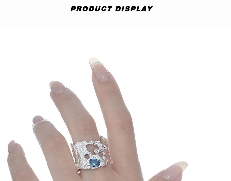 Jewel Type : F.I.N.S Luxury S925 Sterling Silver Hollow Texture Ring INS Gem Blue Oval Zircon Wide Index Finger Cuff Ring Solid Silver Jewels