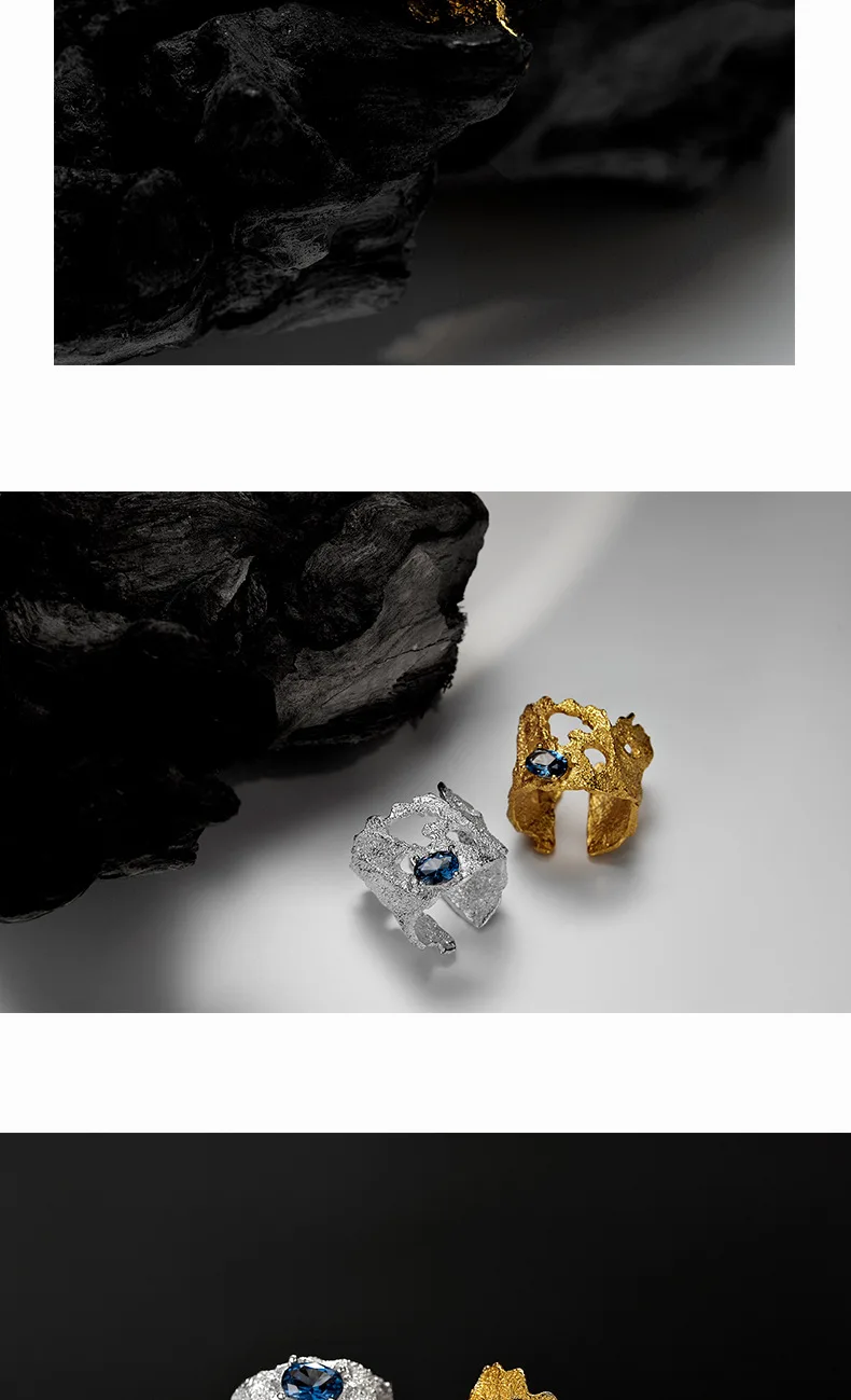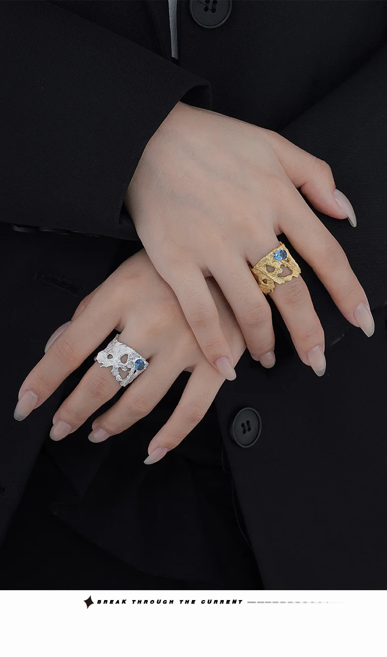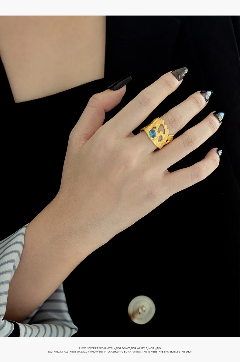 Jewel Type : F.I.N.S Luxury S925 Sterling Silver Hollow Texture Ring INS Gem Blue Oval Zircon Wide Index Finger Cuff Ring Solid Silver Jewels