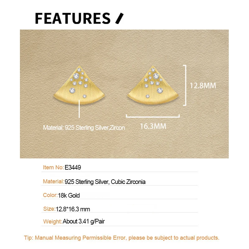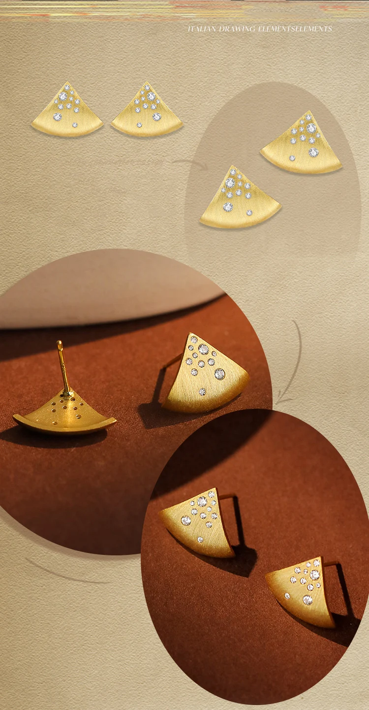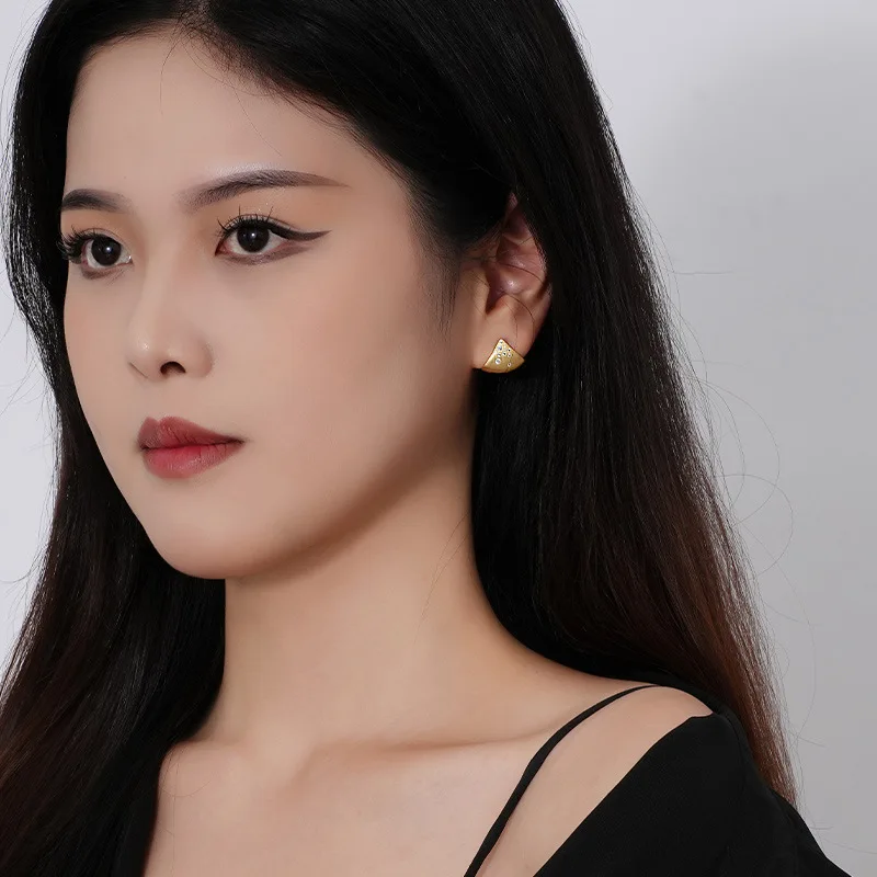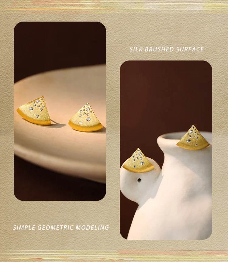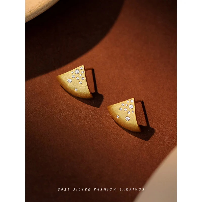 Jewel Type : F.I.N.S Minimalist S925 Sterling Silver Triangle Earrings Gold Brushed Cubic Zirconia Fan-Shaped Piercing Ear Studs Fine Jewelry
