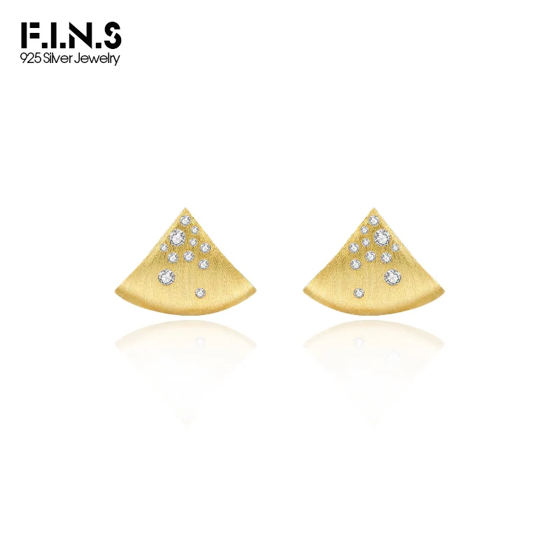 F.I.N.S Minimalist S925 Sterling Silver Triangle Earrings Gold Brushed Cubic Zirconia Fan-Shaped Piercing Ear Studs Fine Jewelry