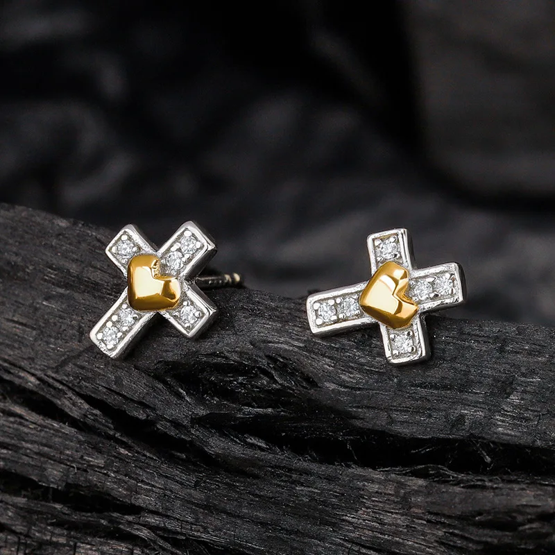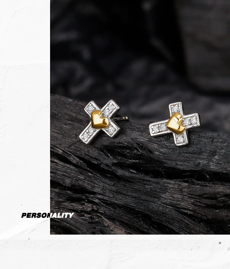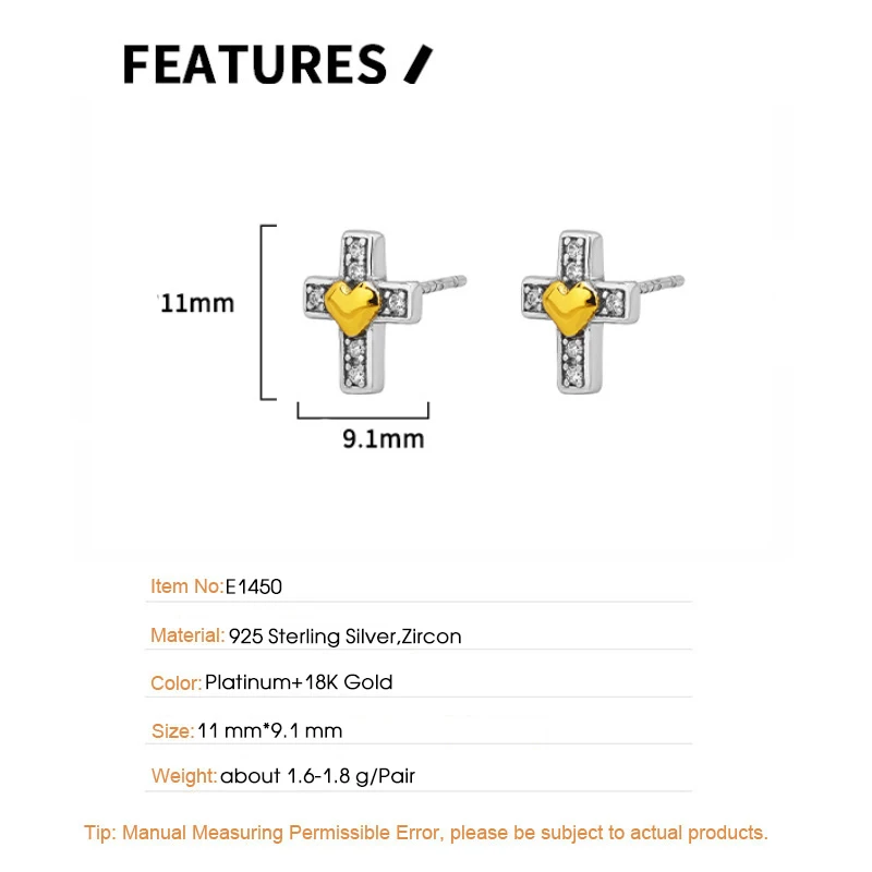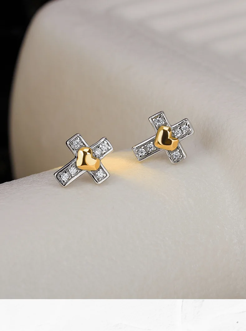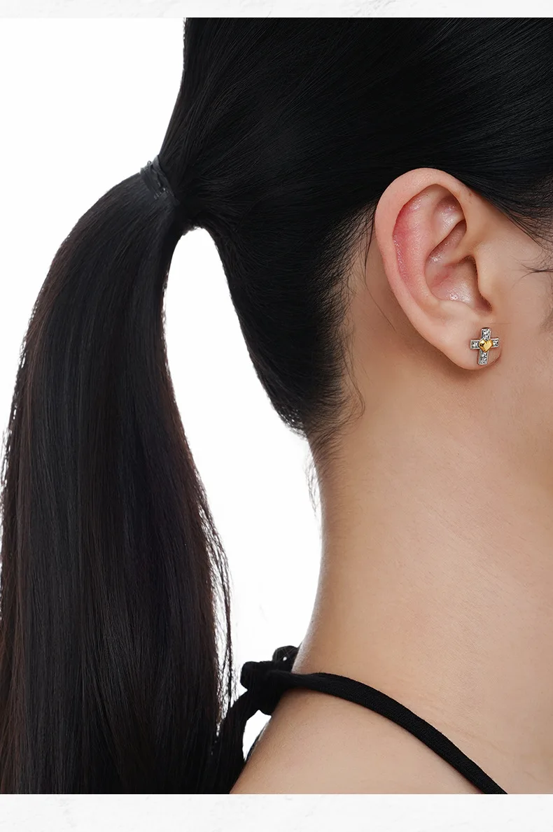 Jewel Type : F.I.N.S Original Color Separation S925 Sterling Silver Zircon Cross Earrings Small Love Heart Piercing Ear Studs Fine Jewelry
