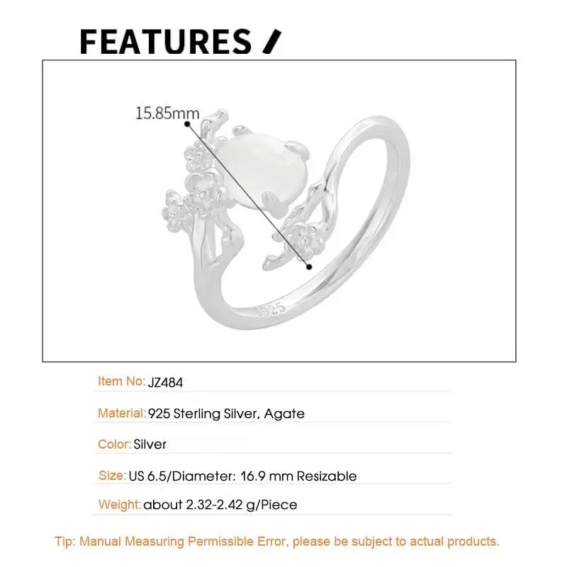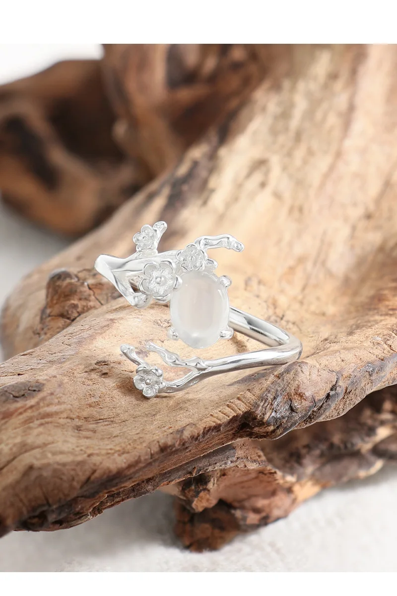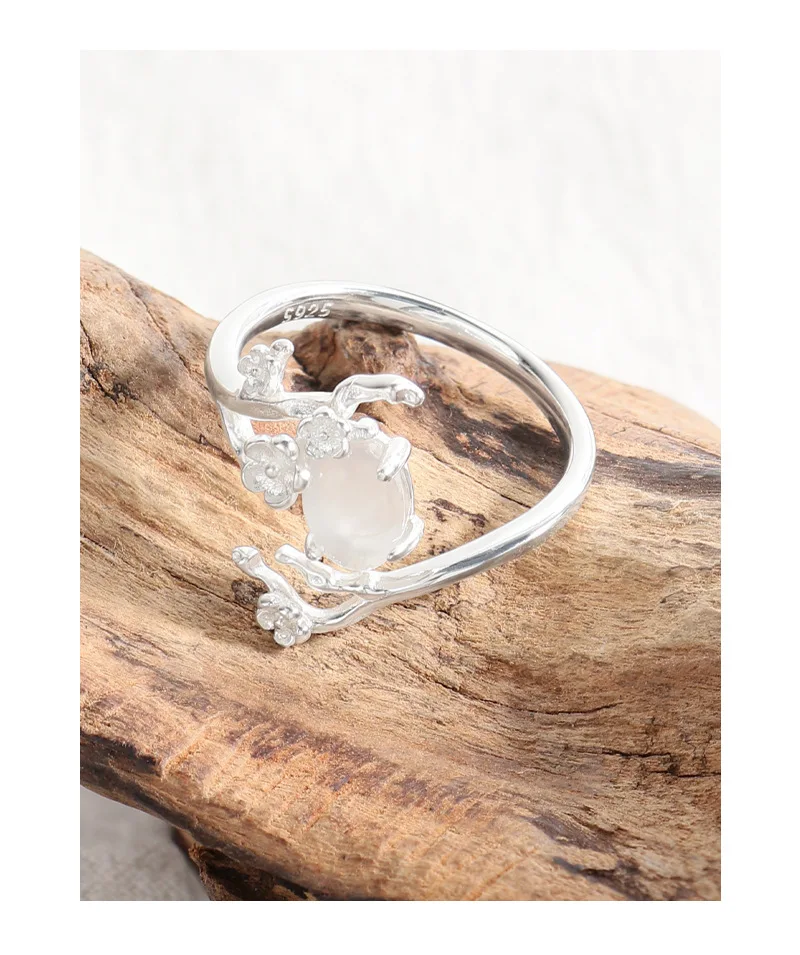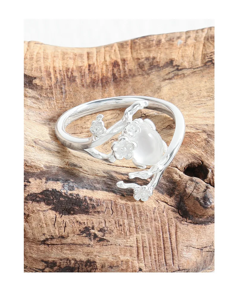 Jewel Type : F.I.N.S Original Design S925 Sterling Silver Ring Plum White Agate Open Adjustable Flower Finger Fine Jewelry Anti-Allergic