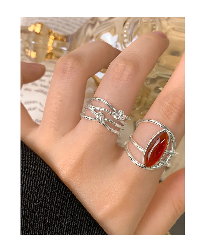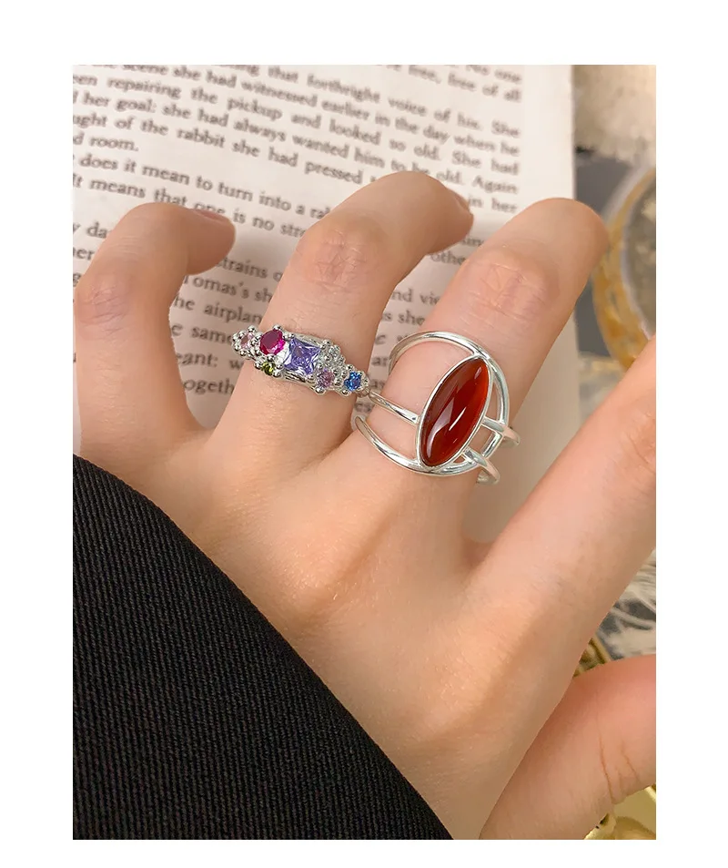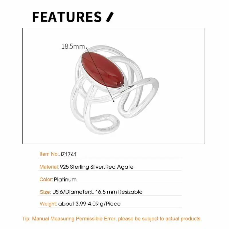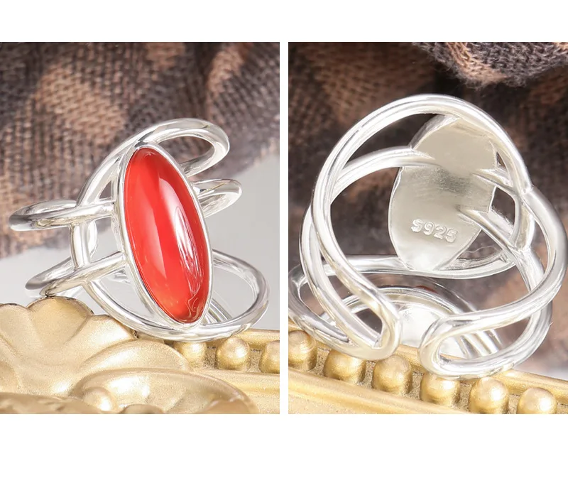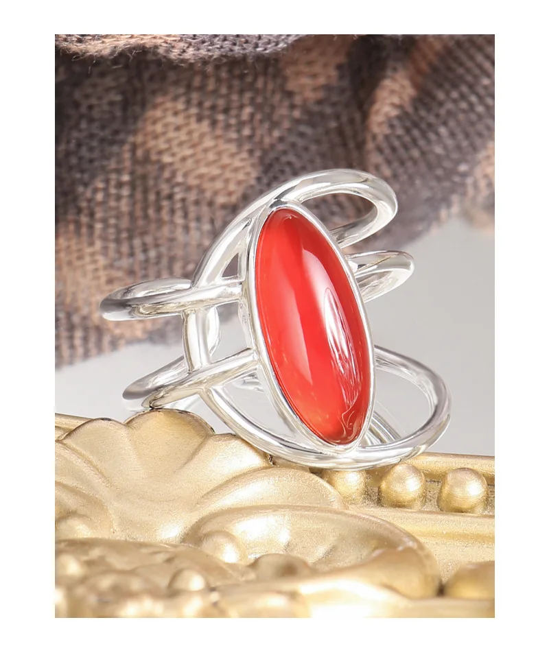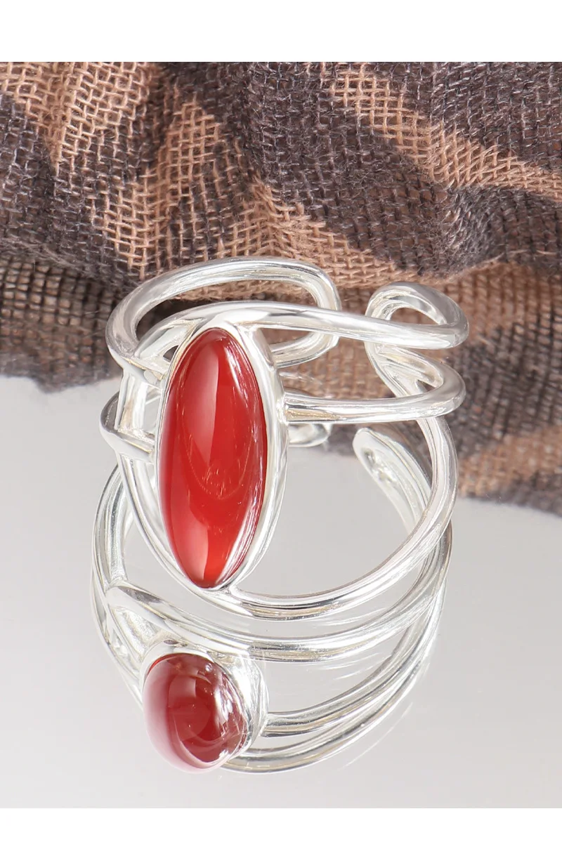 Jewel Type : F.I.N.S Original Style S925 Sterling Silver Opening Ring Exaggerated Red Agate Irregular Layered Lines Adjustable Finger Jewelry