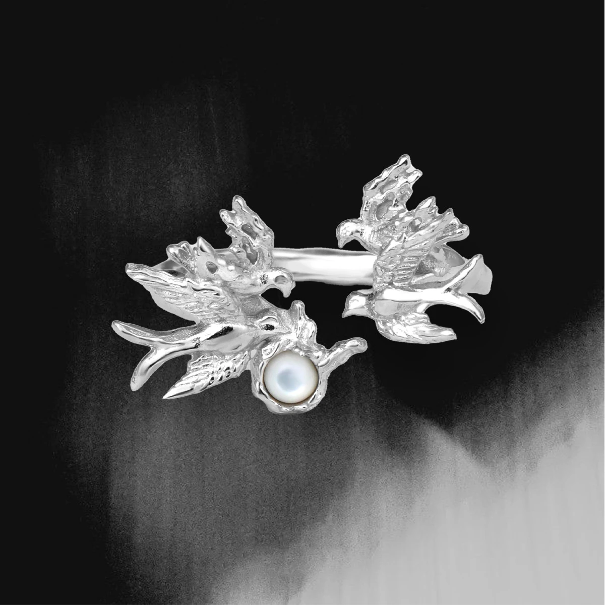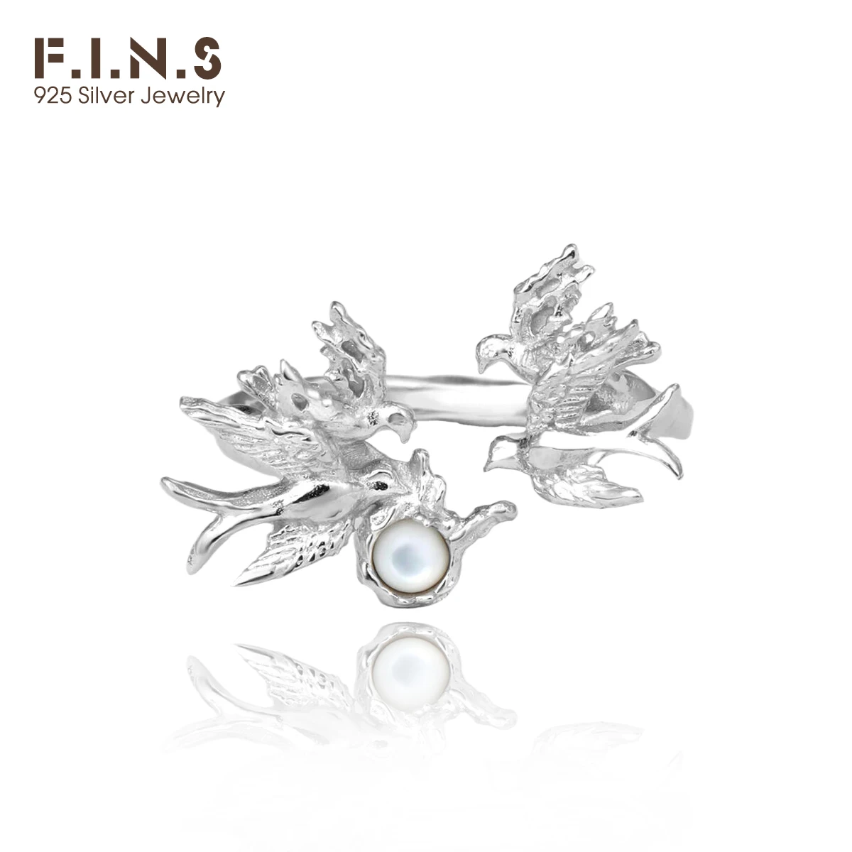 F.I.N.S Original Temperament S925 Sterling Silver Ring Birds White Shell Opening Adjutable Finger Hypoallergenic Fine Jewelry