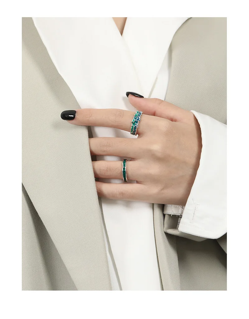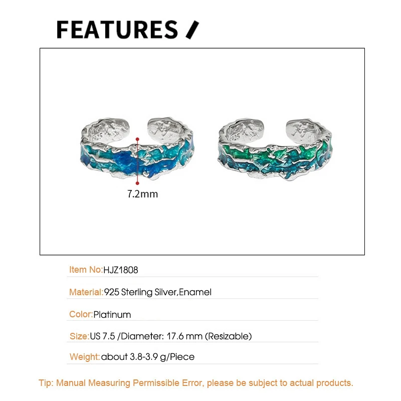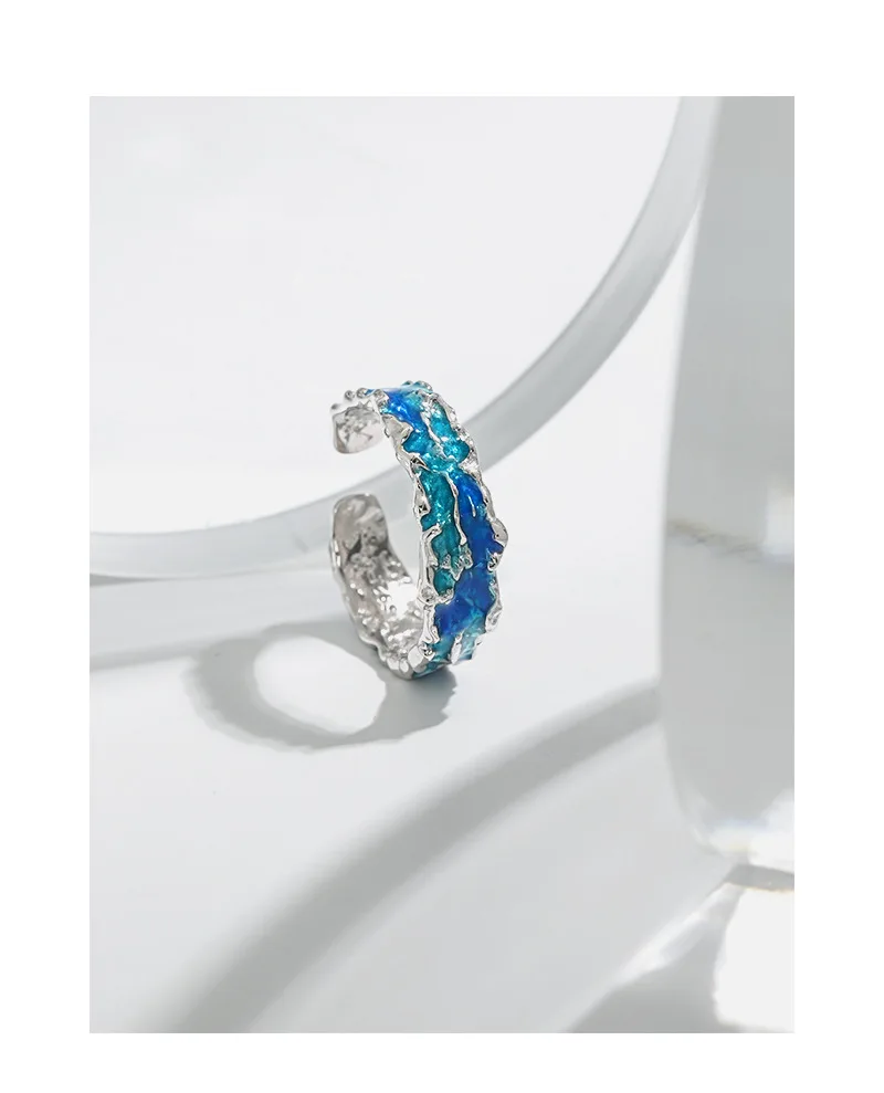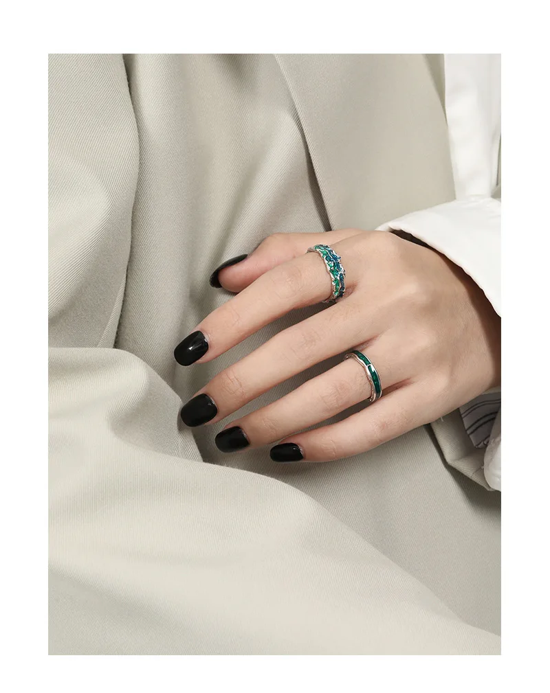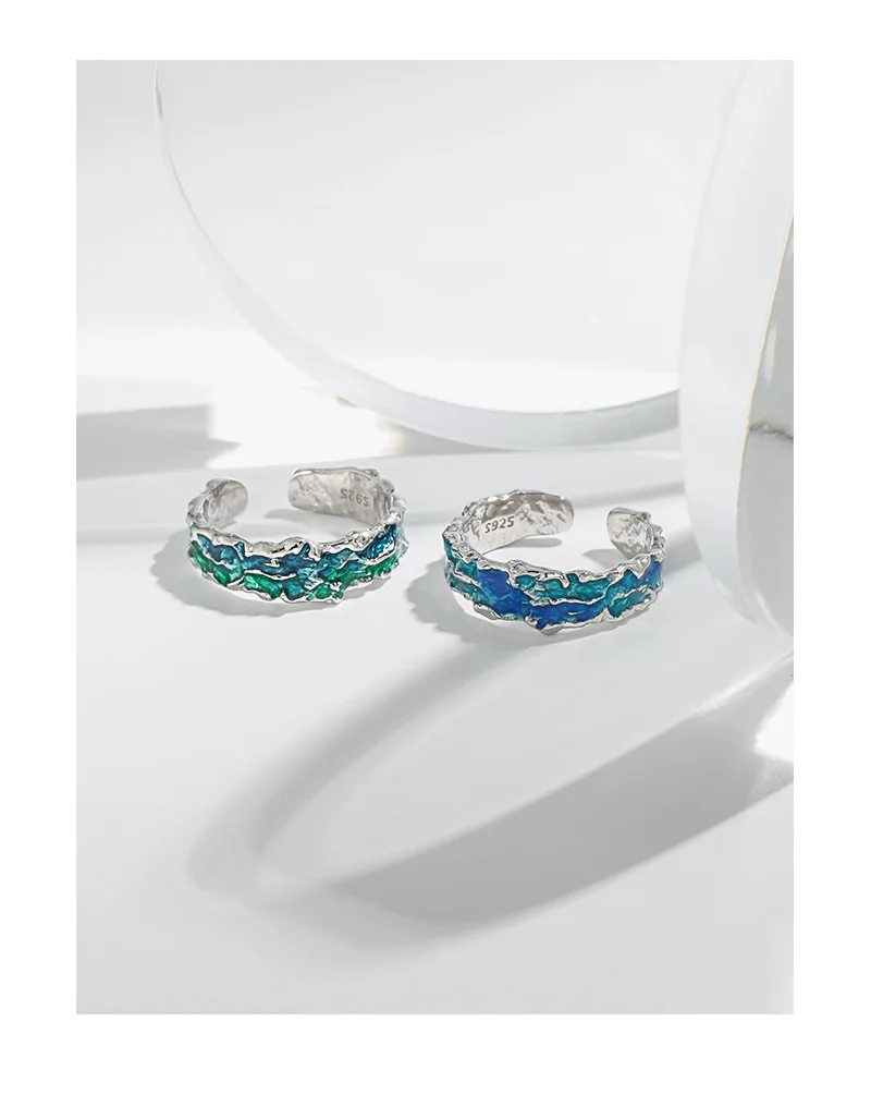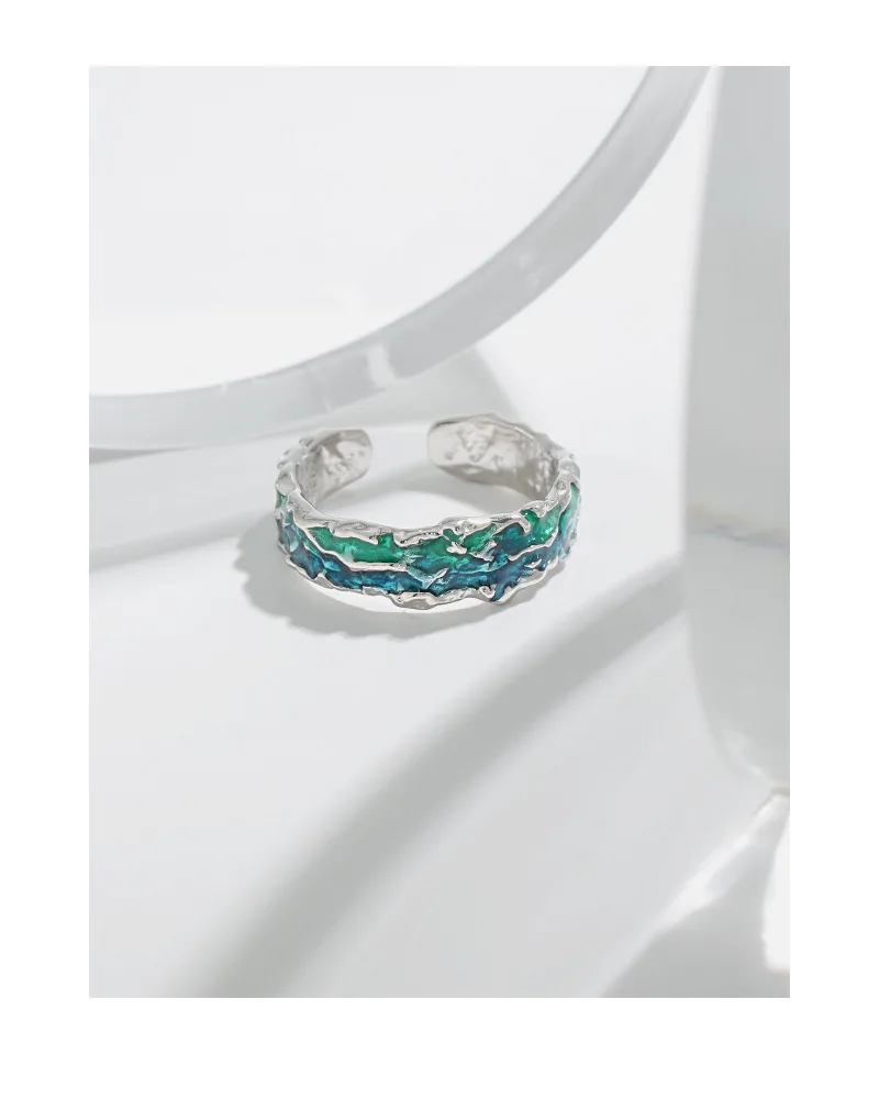 Jewel Type : F.I.N.S Original Texture Irregular 100% S925 Sterling Silver Open Ring Concave Convex Blue Green Enamel Resizable Finger Jewelry