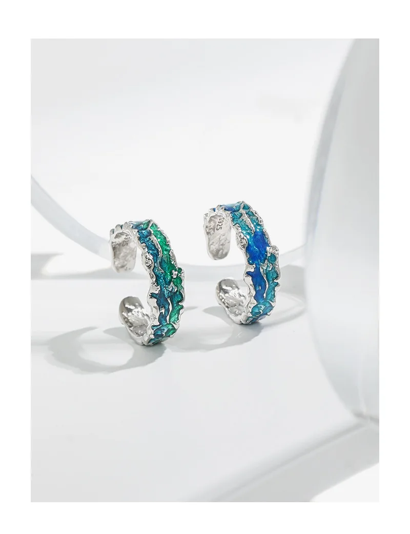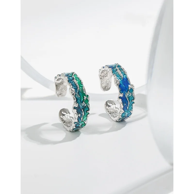 F.I.N.S Original Texture Irregular 100% S925 Sterling Silver Open Ring Concave Convex Blue Green Enamel Resizable Finger Jewelry