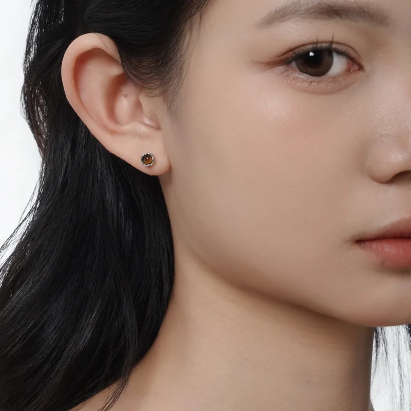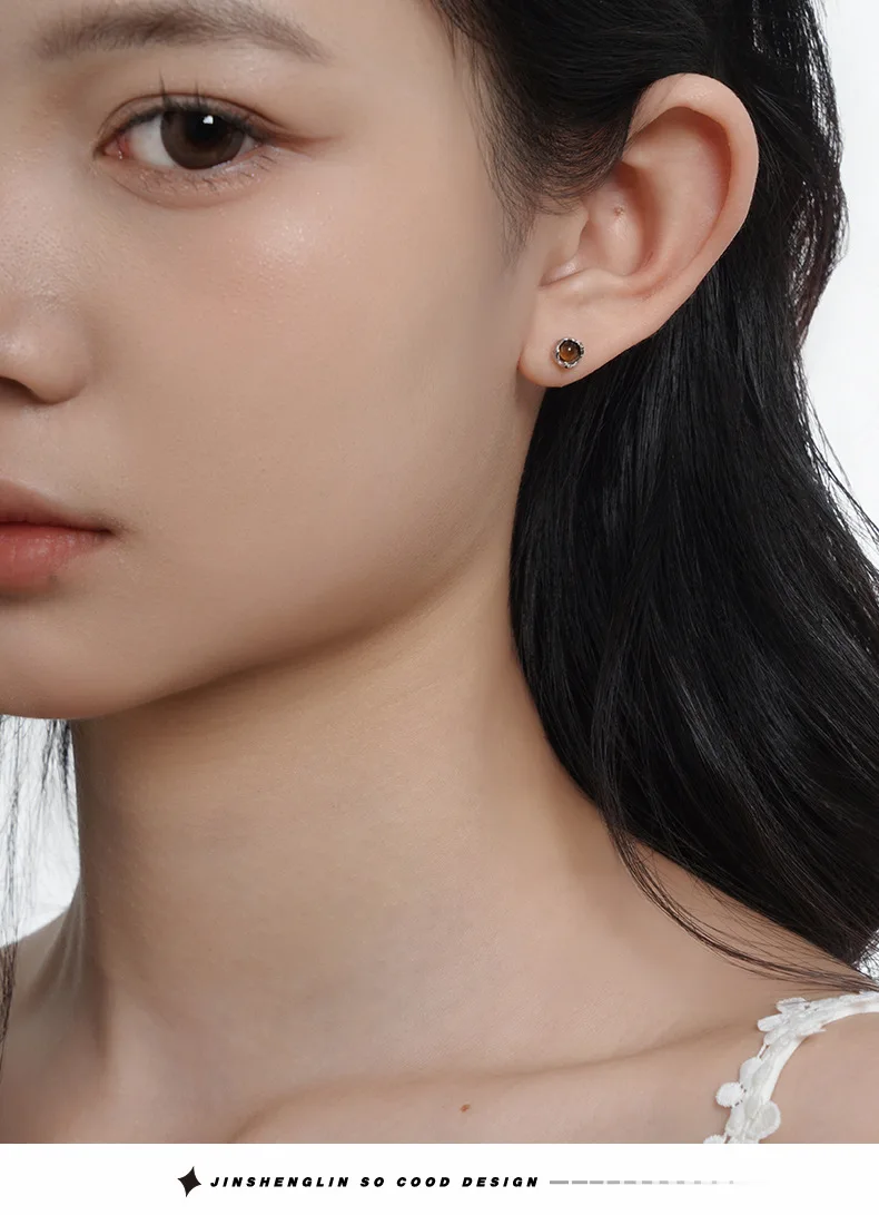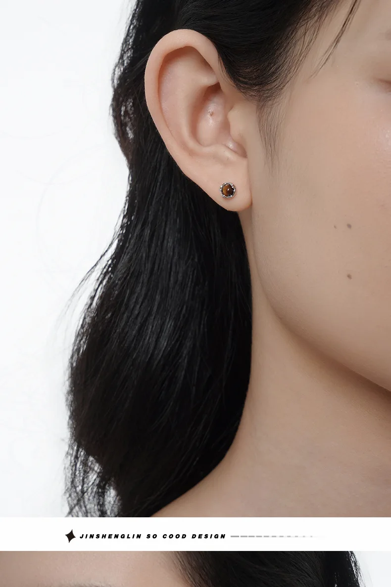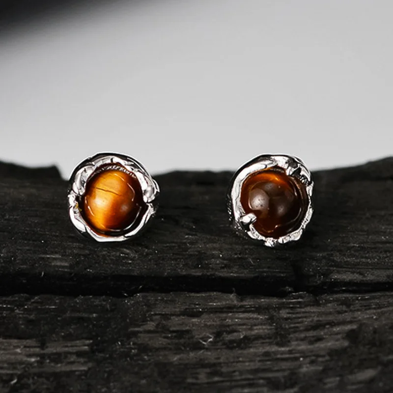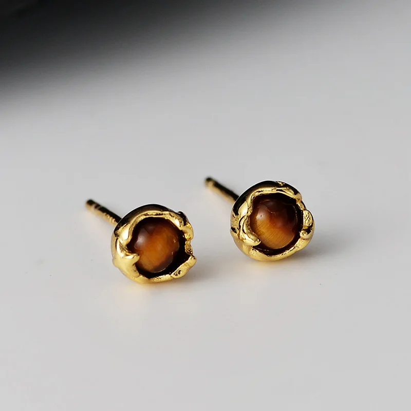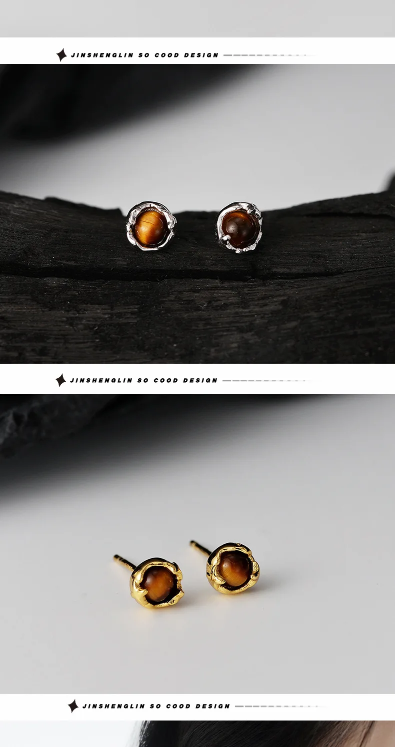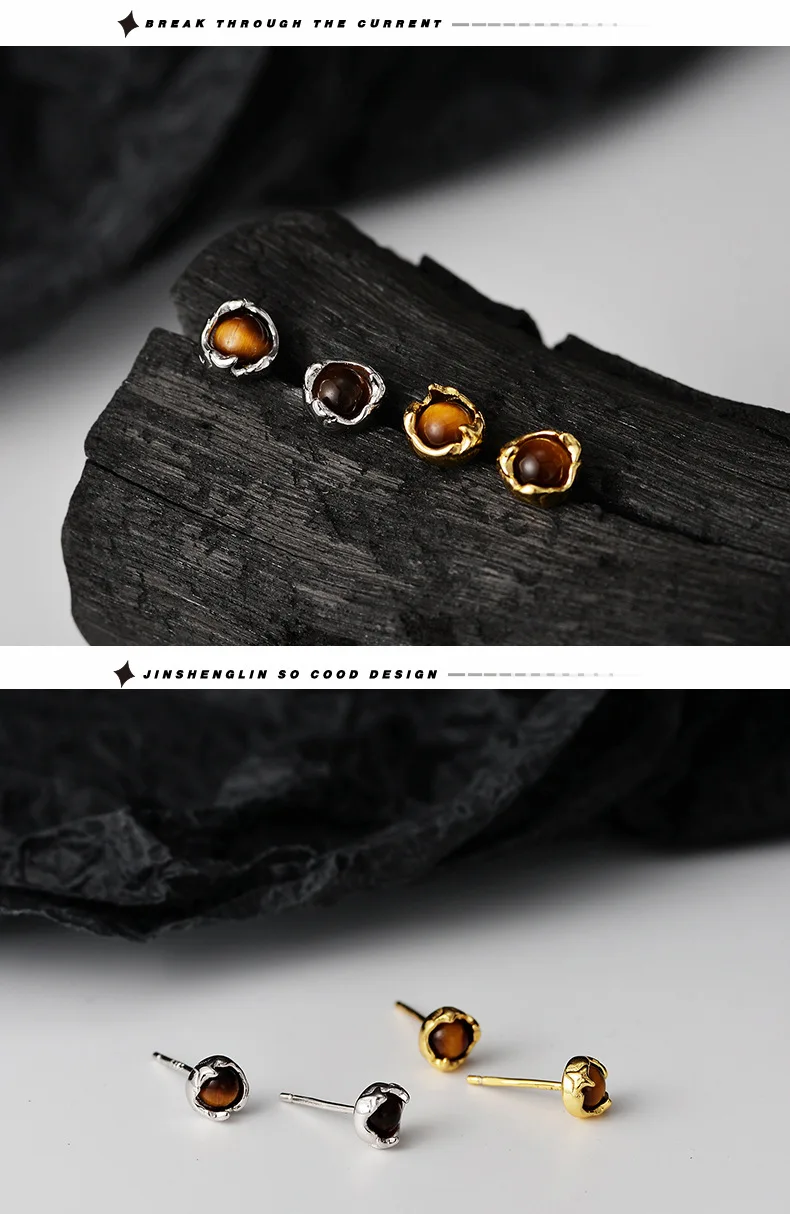 Jewel Type : F.I.N.S Retro Simple S925 Sterling Silver Gradient Tiger Eye Stone Earrings Irregular Small Round Piercing Ear Fine Jewelry