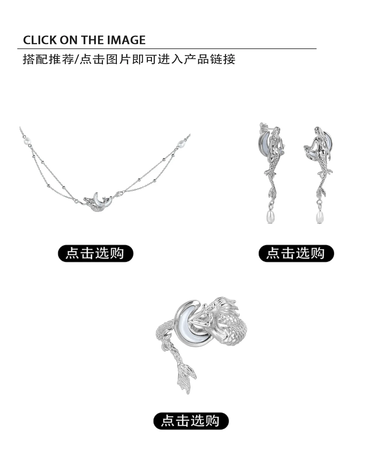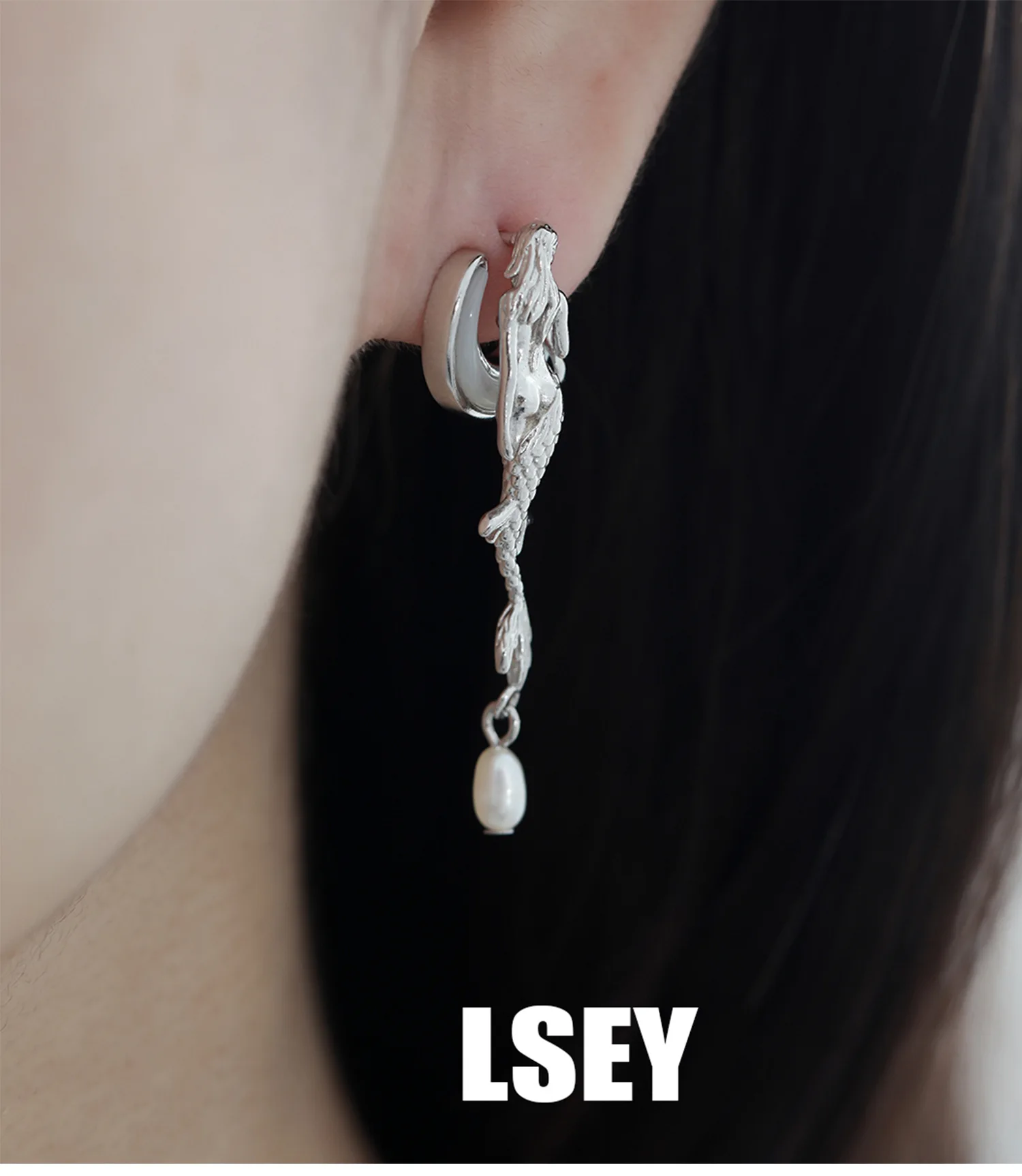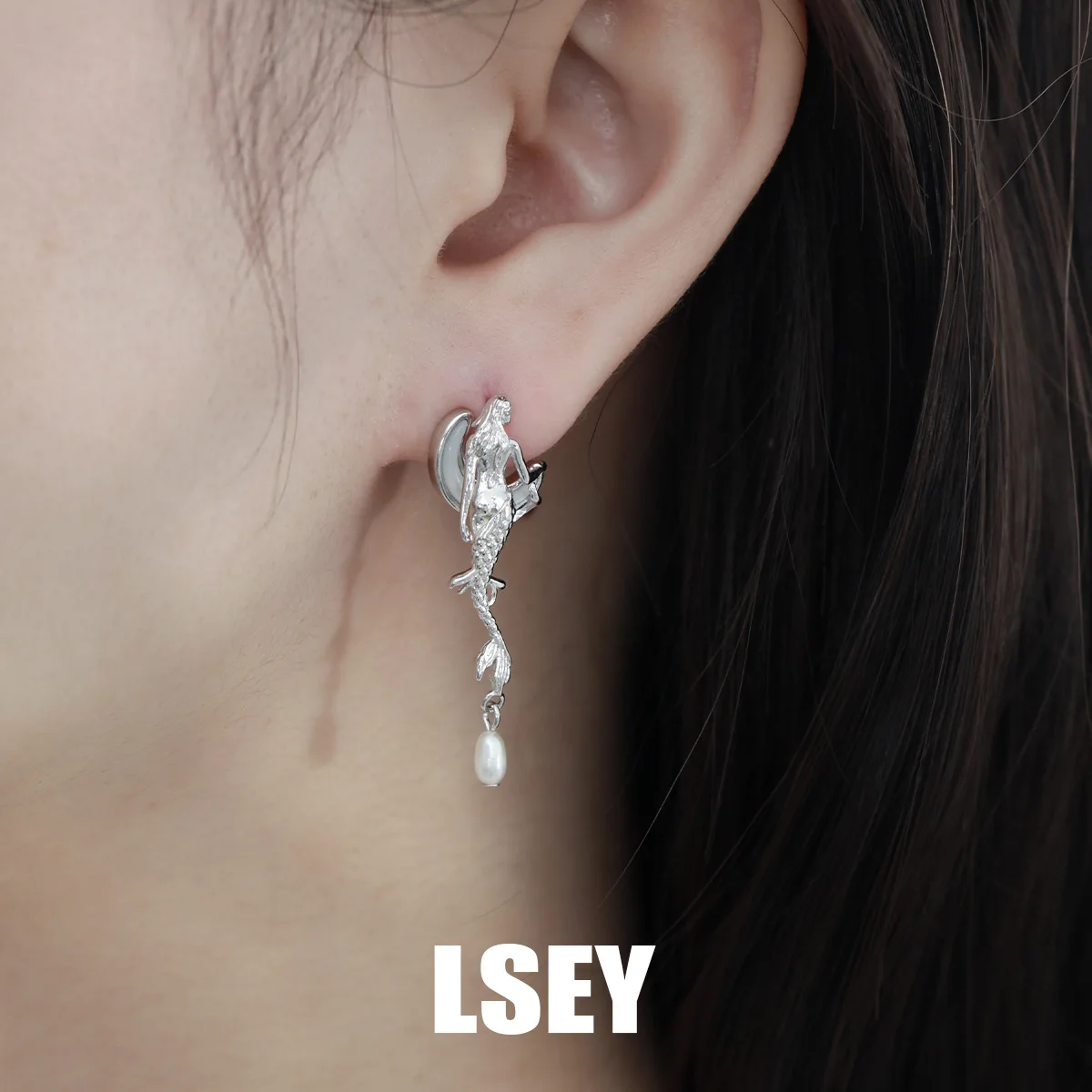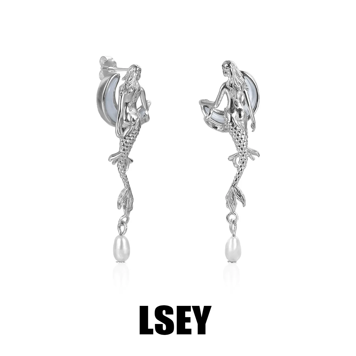 MLKENLY Unique 925 Sterling Silver Mermaid Moon White Shell Earnail Cold Wind Small Stud Earrings for Women Silver Jewelry