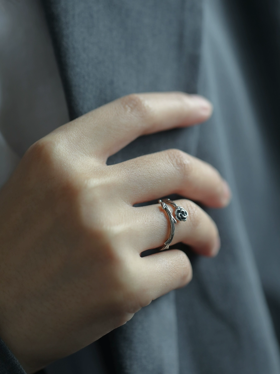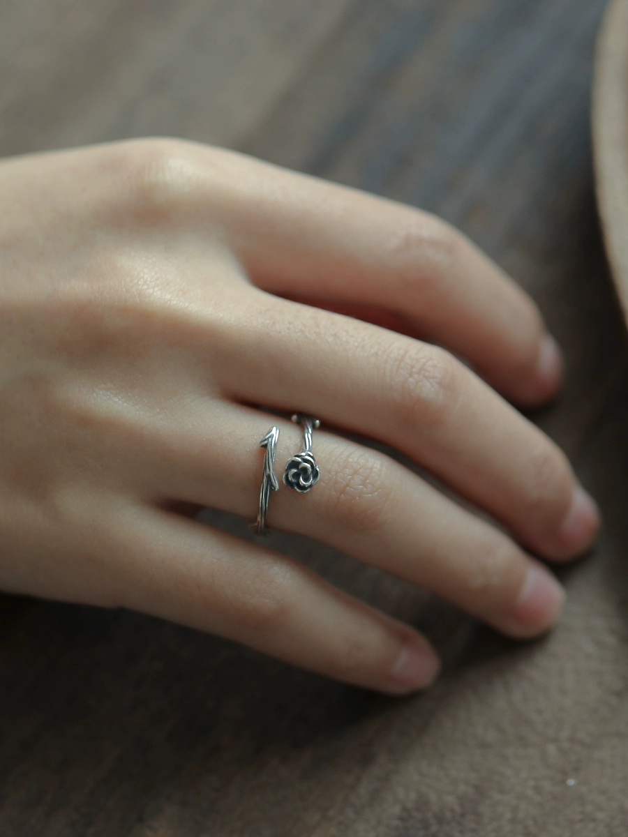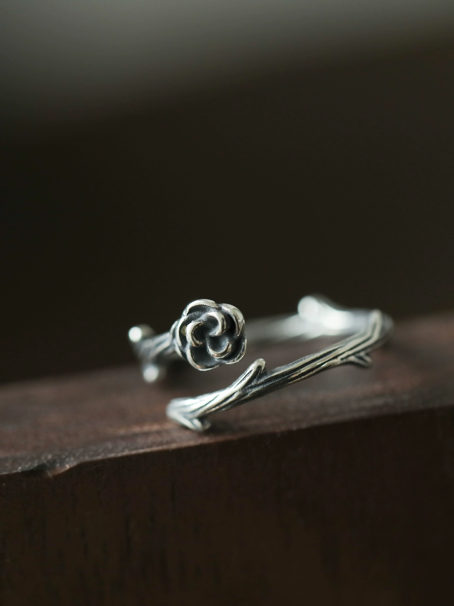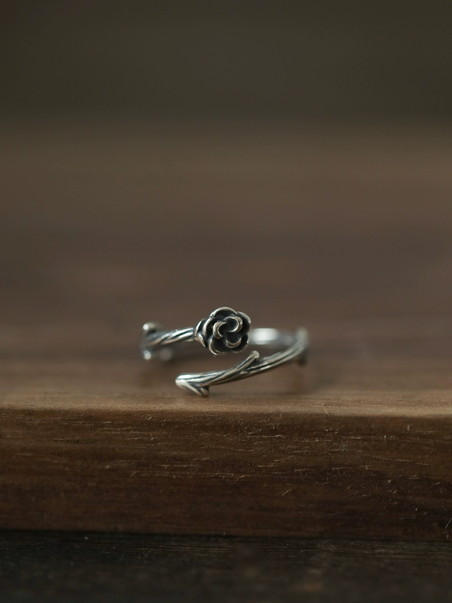 Pattern Veinsbrick “Thorn Flower” retro aged petals with thorns sterling silver S925 open adjustment ring