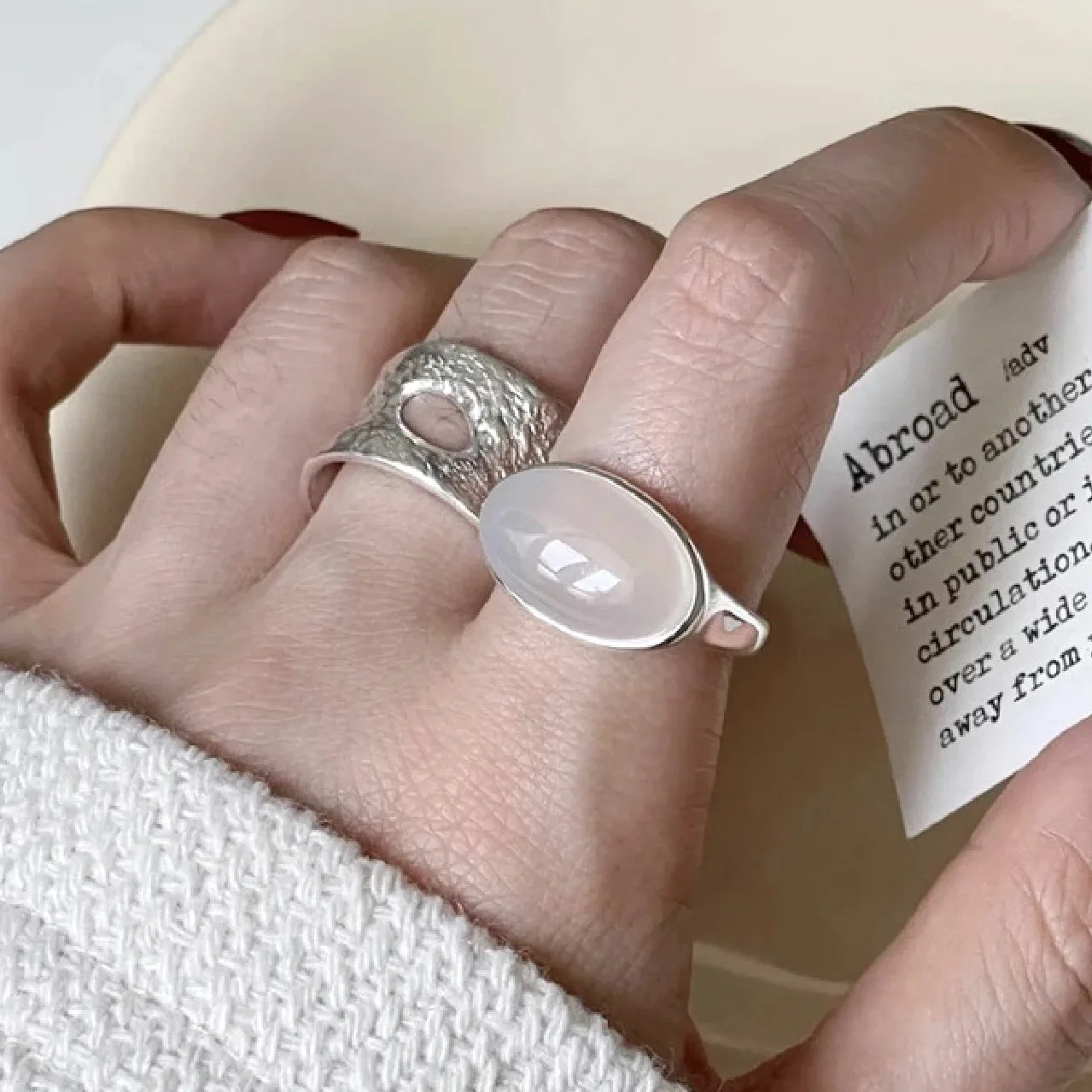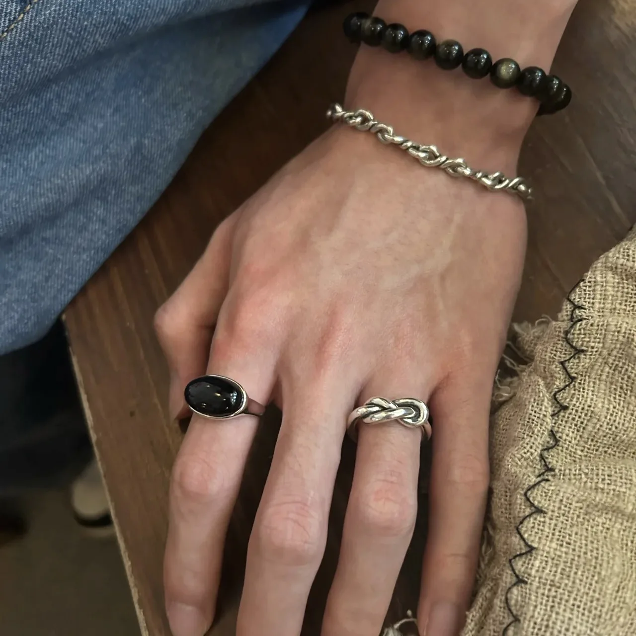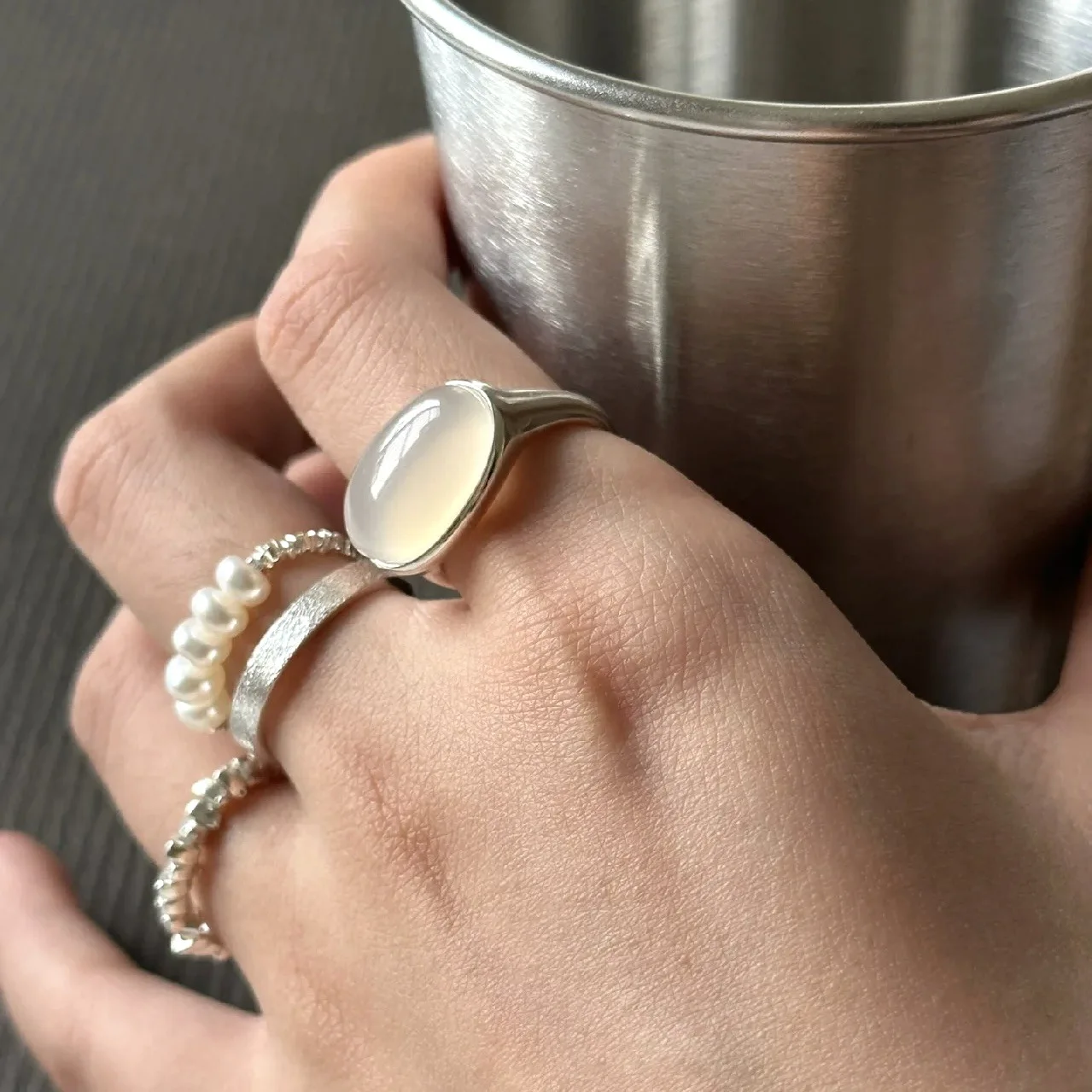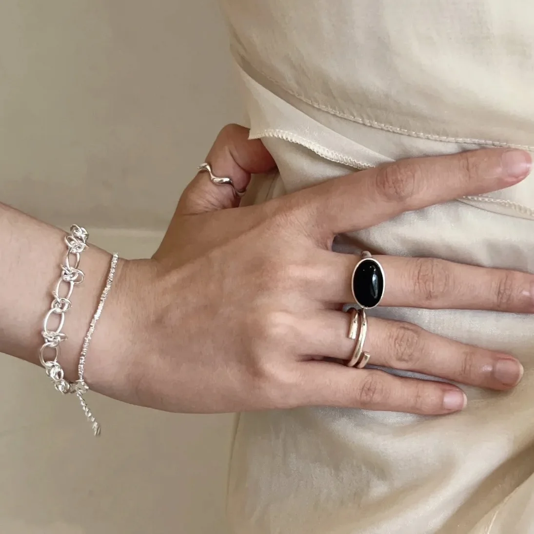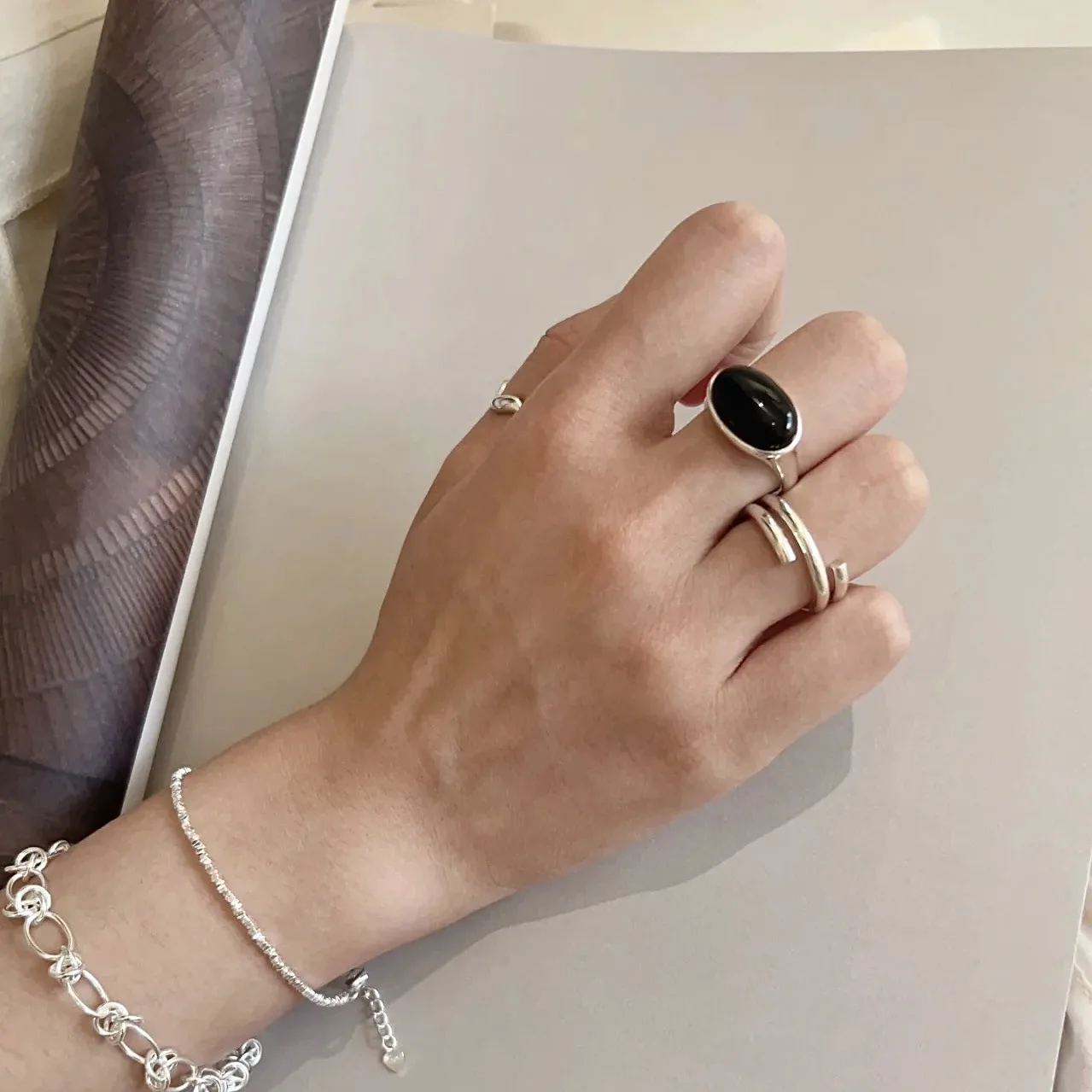 S925 Silver Chalcedony Oval Ring French Style Black Agate Minimalist Stacking Statement Finger Jewelry for Women