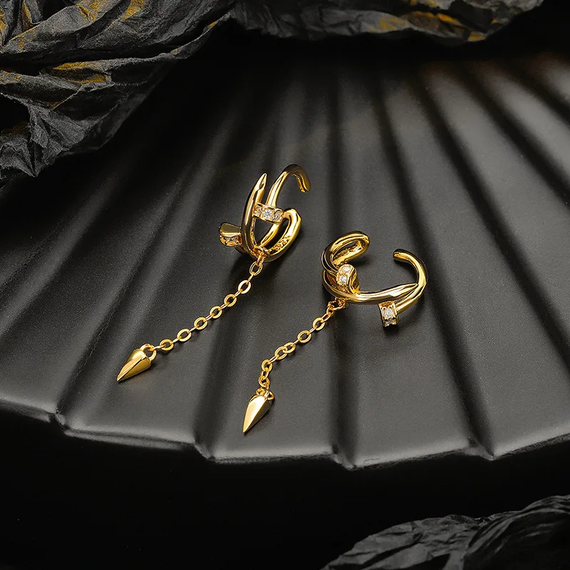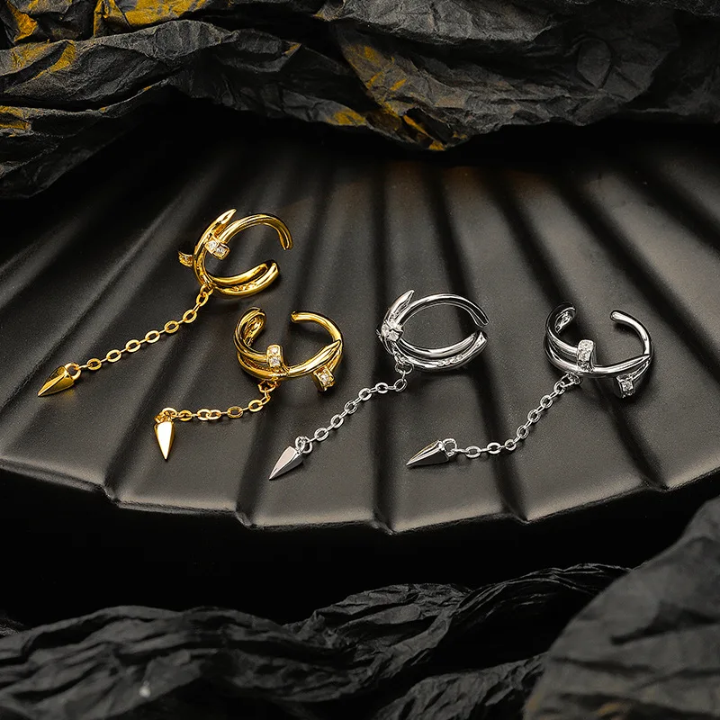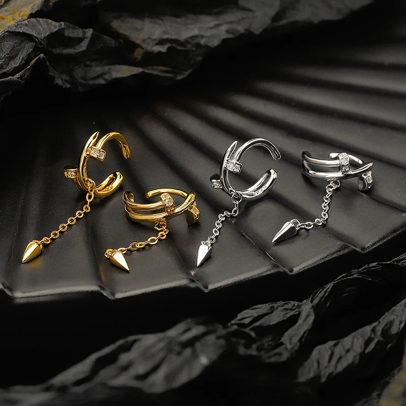 S925 Sterling Silver Diamond studded nail earrings for women without ear holes, sweet and cool long tassel ear clips
